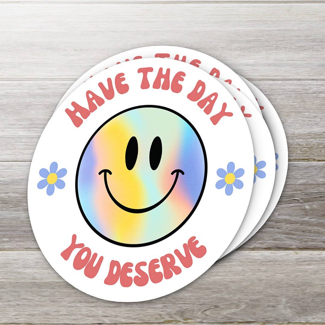 "Have a not-so-shitty day" face sticker - 2.5" round - Available with or without packaging in cellophane hanging bag and recycled kraft paper backing card - Printed on matte white vinyl - Die cut - Weatherproof and waterproof - Suitable for outdoor use - Made in the USA - Easy crack and peel tab, Smarty Pants logo is not part of the sticker - Hand wash recommended when applied to water bottles