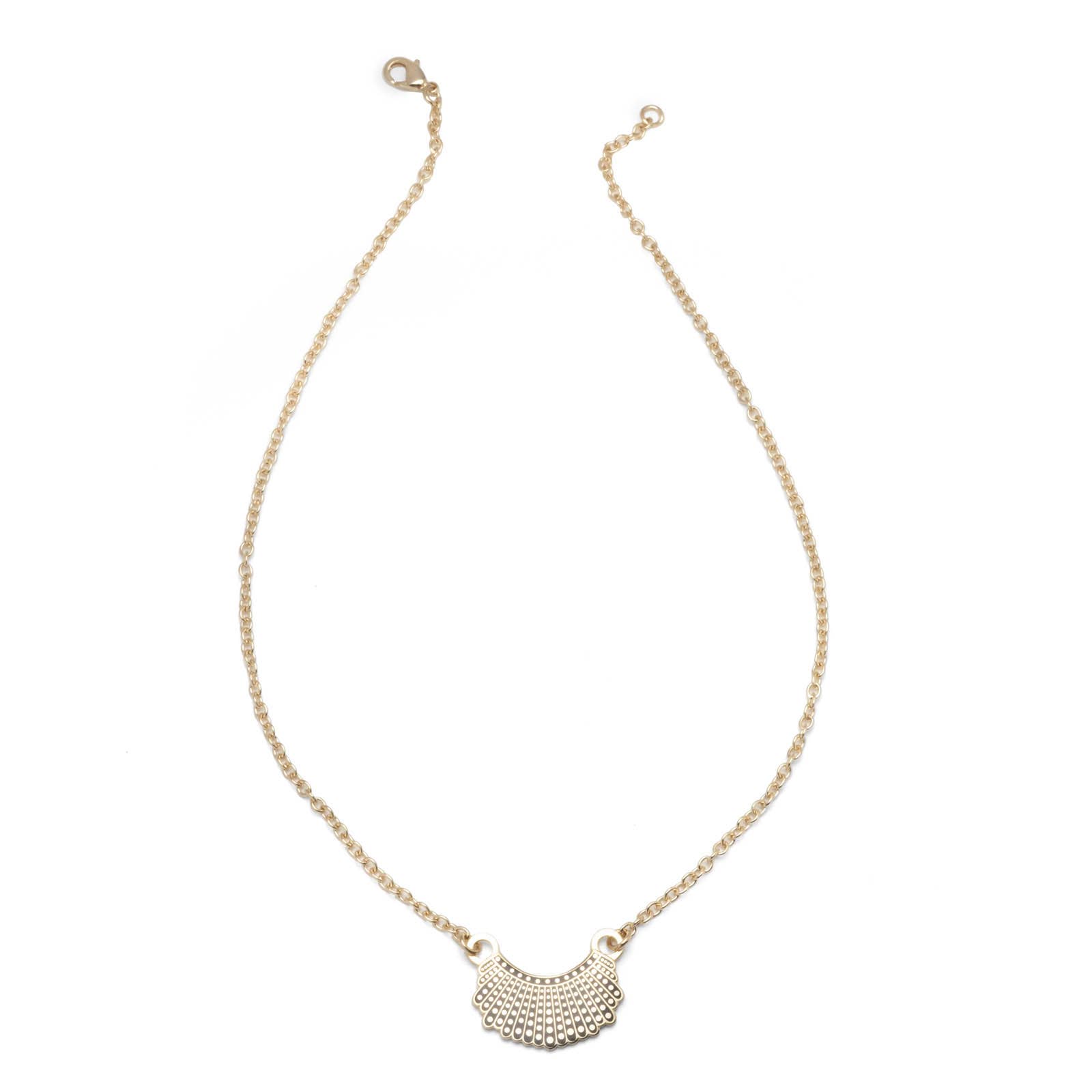 Justice Ruth Bader Ginsburg has a special collar she wears on days when she dissents from decisions being handed down by the Supreme Court. Now, you can wear your own dissent collar in the form of this necklace with a 1" hard enamel pendant. Chain length: 16". Comes with matching 4" extender 50% of profits from the this necklace are split between three organizations: The Bronx Freedom Fund International Refugee Assistance Project Center for Reproductive Rights Note this necklace contains nic.