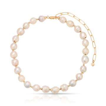 Our best-selling traditional statement necklace. The Details Luminous white mother of pearl. 18 x 16mm large pebble pearls. Signature lasso and hook clasp. Hand-knotted with matching thread. Overall length 20”. Polished 14-karat gold over brass.