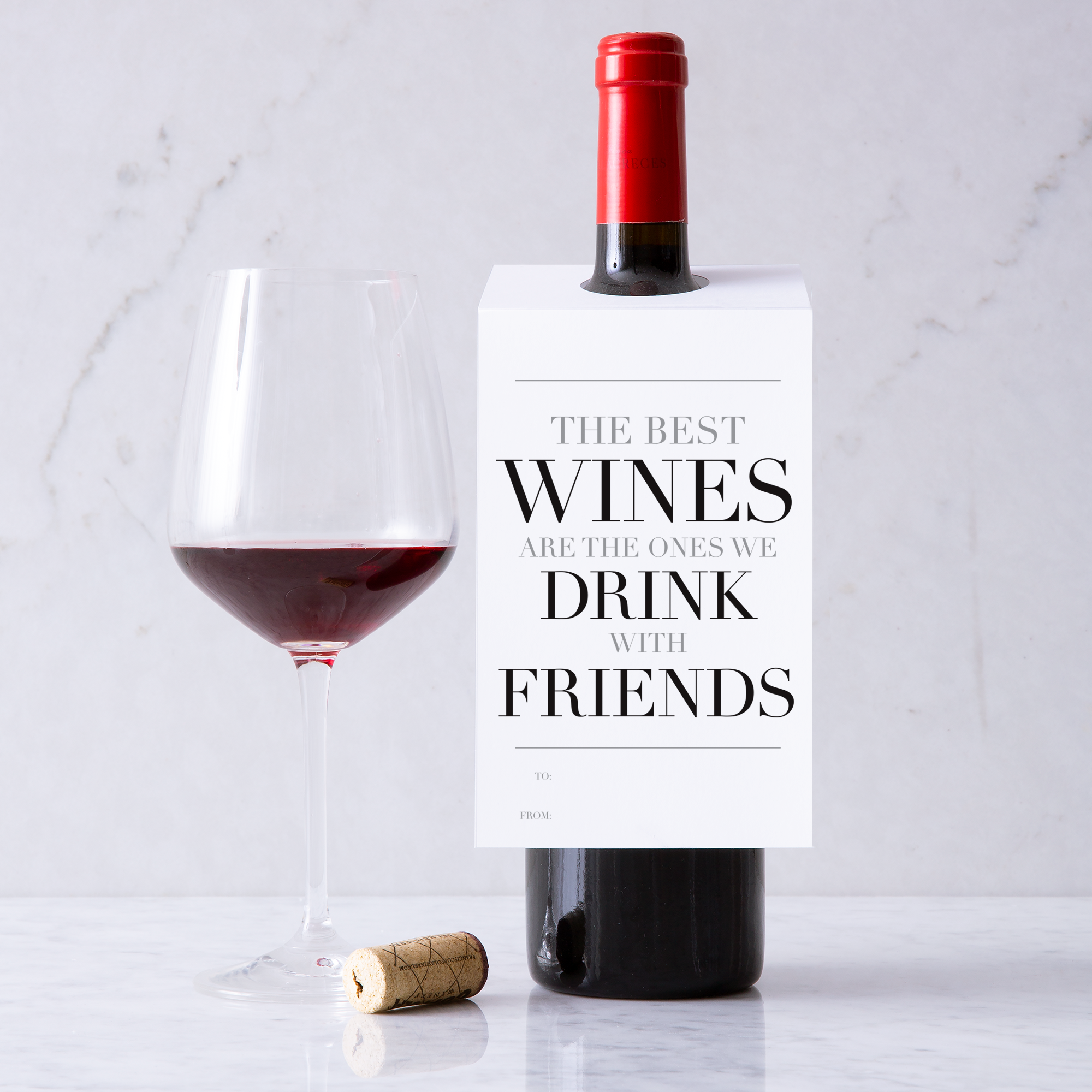 Wine Tag: "Cheers to you!" Cheers! Our witty wine gift tags (adorned with “to” and “from”) will instantly turn any bottle of wine or bubbly into the toast of the town. Simply slip our wine gift tags over your favorite bottle of wine or champagne for a memorable gift! DETAILS Printed on premium paper. Packaged in clear acetate sleeve. Fit perfectly on the wine bottle neck. FSC certified-sustainable paper.