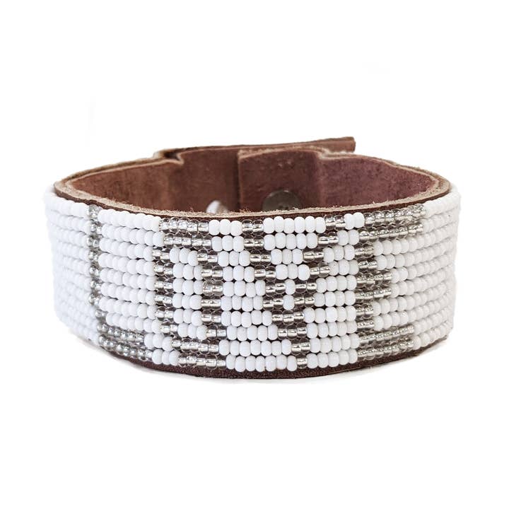 Swahili Coast - Wholesale Bangle Bracelet - Medium Love Beaded Leather Cuff - White - Affirmations