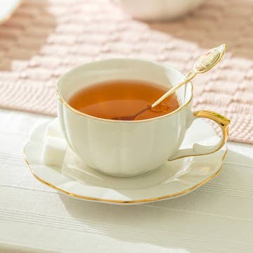 This delicate and petite glass has a single finger-sized handle. The sentiment faces towards you when held in the right hand and away when held in the left hand. The 7 oz 207 mL teacup measures 2.75" tall, 4.75" long, and 3.5" in diameter, while the plate measures 5.25" in diameter and 1" in height. It is Packaged securely in a die-cut box. . The greenery electroplate silver design is a blue-to-clear ombre and is accompanied by a black "Rest Relax Rejuvenate" sentiment decal on the front side of the iridescent cup. Electroplated silver detail surrounds the lip of the glass and the rim of the plate. . Hand wash only with the soft side of the sponge. Do not leave it soaking in water for extended periods. Dry immediately after washing. Due to its silver detailing, it is not microwave-safe. .