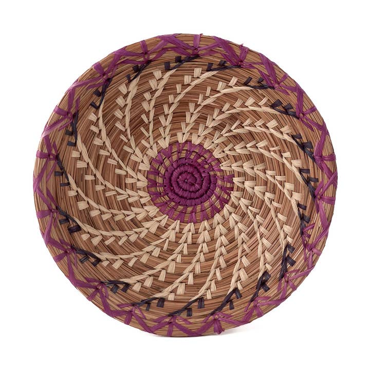 The Fina Basket is a smaller version of the popular Josefina Basket, It's delicately handwoven of native grass and pine needles with colorful raffia accents and a scalloped rim. Handmade and designed by the women of Mayan Hands, this basket is a wonderful tabletop accent but was designed to be used. Approximately 7"W x 1.5"H