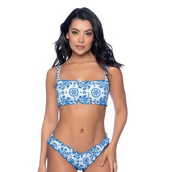 Hate to write a bad review but hoping it will help others. Everything about this suit says cheap. The stitching is nice but the material, clasp in the back and no ability to adjust the strap will make this set a hard sell. It photographs well, but in person, not so much.