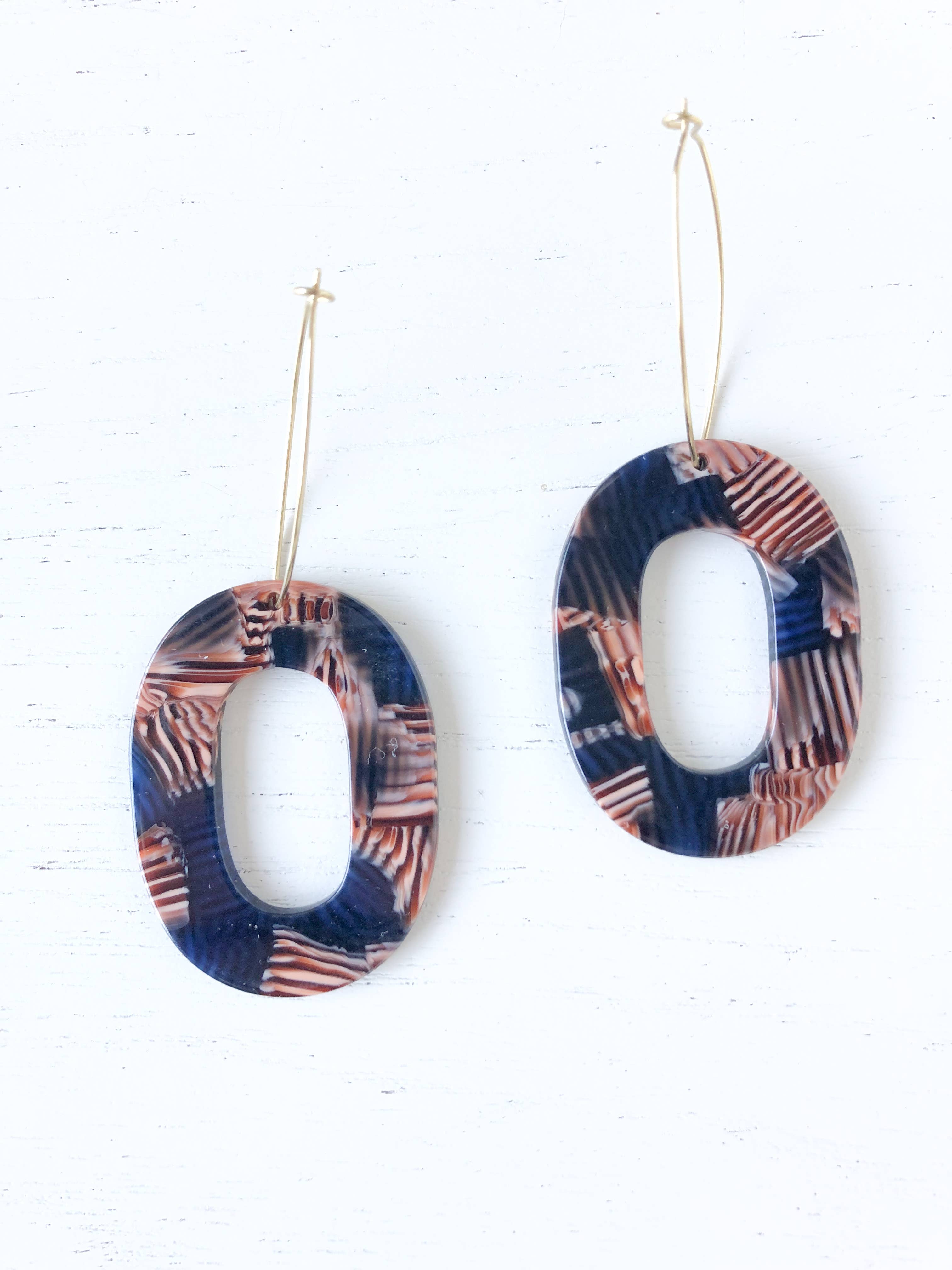 Brass hoops with blue tortoise shell resin detail. Earrings measure approximately 2-7/8” in length.