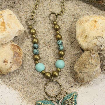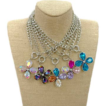 Gypsy Junk Original-Blues 24” necklace These Gypsy Junk necklaces are unique and full of personality. We offer several color schemes with many different charms and trinkets. It is like hidden treasures that you wear. Each one is unique to your personality or how you want to express yourself for the day. Never wear dull jewelry. You will be stopped and asked about this wearable piece of art. These sell out at any market we attend. This color palette is Blues, Aqua pinks, turquoise and iridescent crystals. The crowning jewel Fuchsia *which could vary in shape color and size* So many trinkets and treasures. Crosses , Inspirational charms and assorted handmade beaded charms and handmade beaded chain. These are designed and handcrafted by the owner and the artisan in our studio. This is so stunning in person