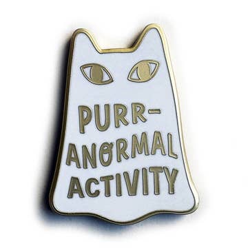 Hard enamel, 1.35” height, black nickel plated, print. If they fits, they sits. This hard enamel pin is black nickel plated, and features silkscreened details. It has two green rubber clutches, and a super cute backer card. Attach this fraidy cat to your favorite piece of clothing/accessory, or display her like a work of art. Measures 1.35” from ears to floor.