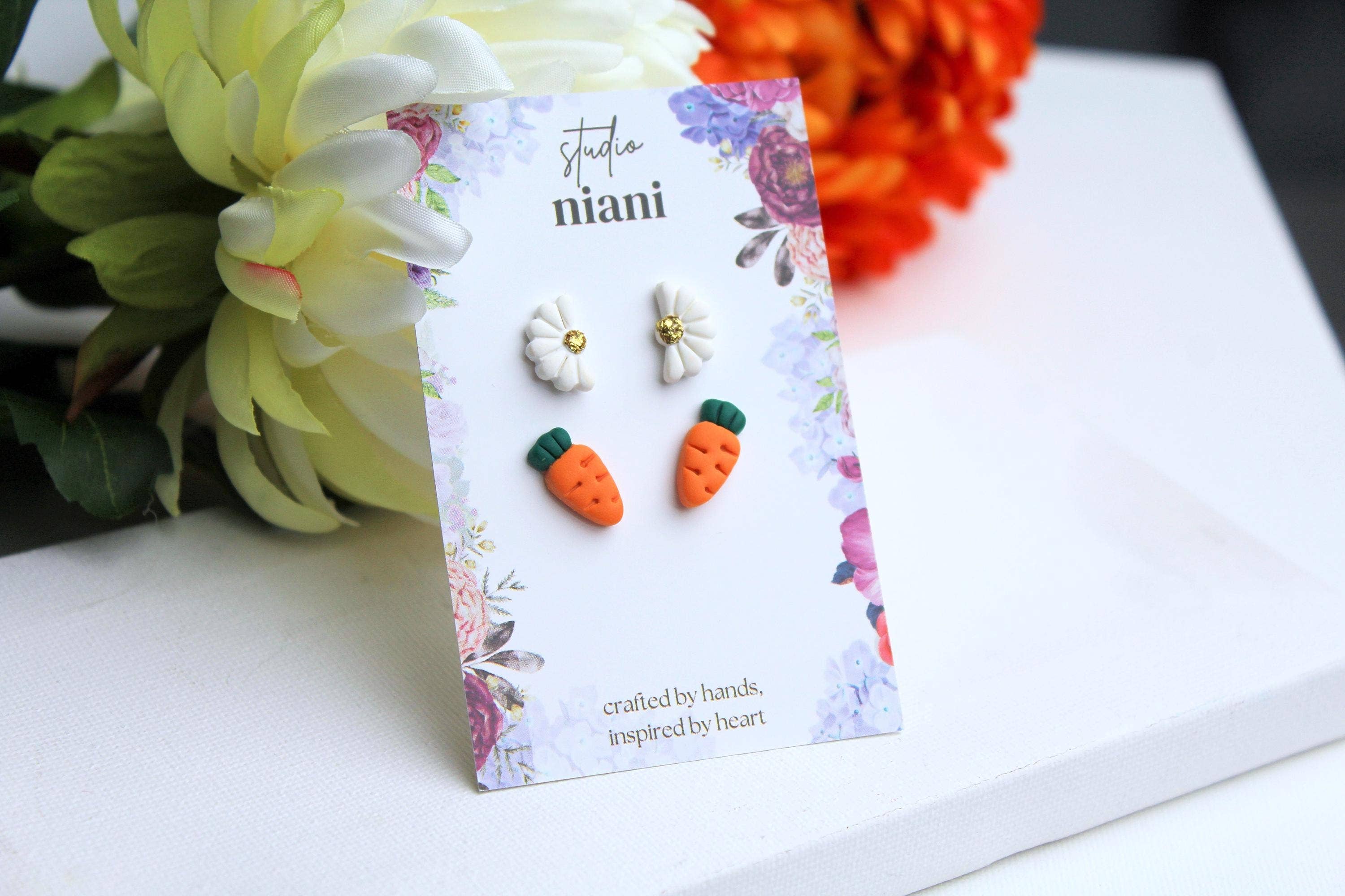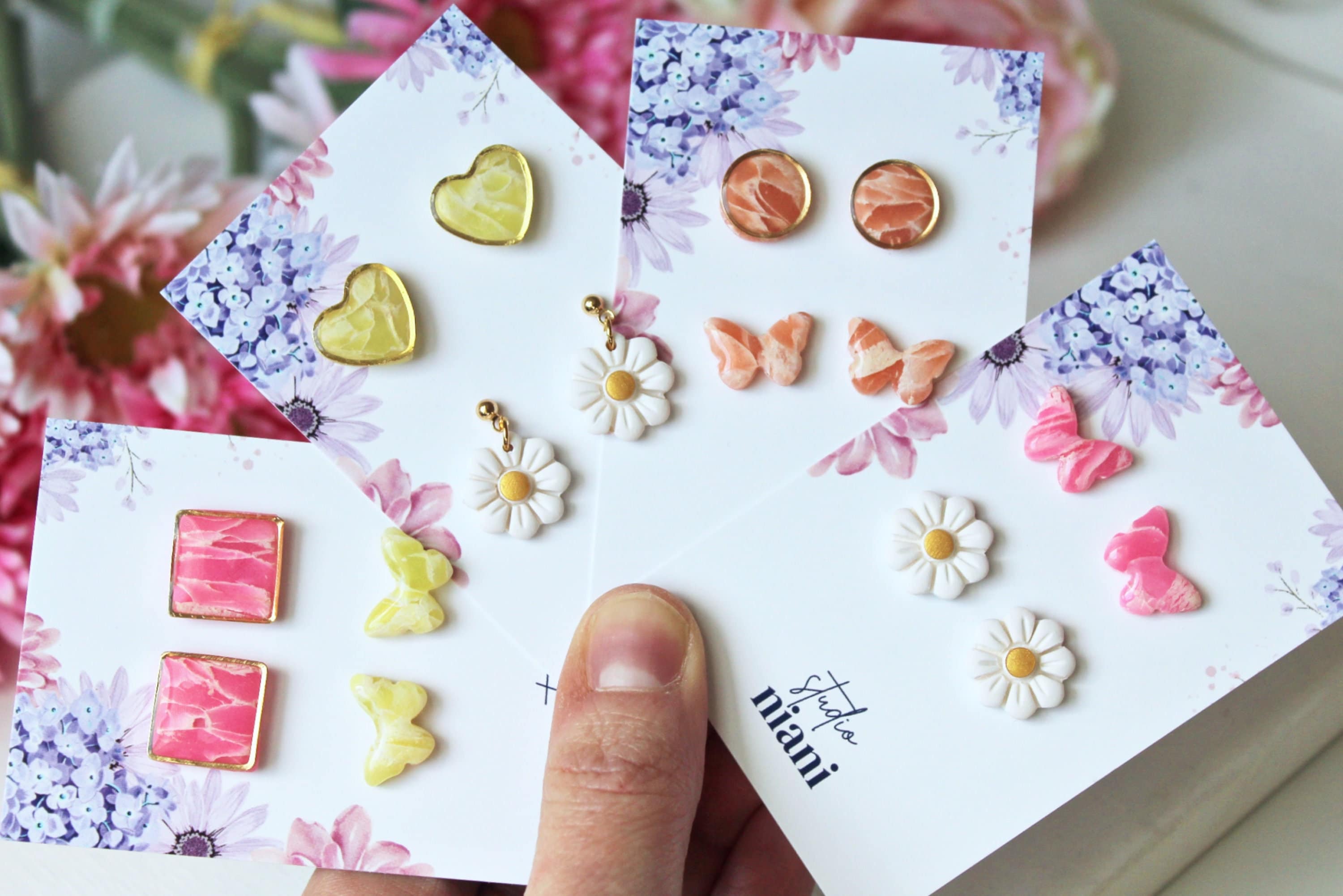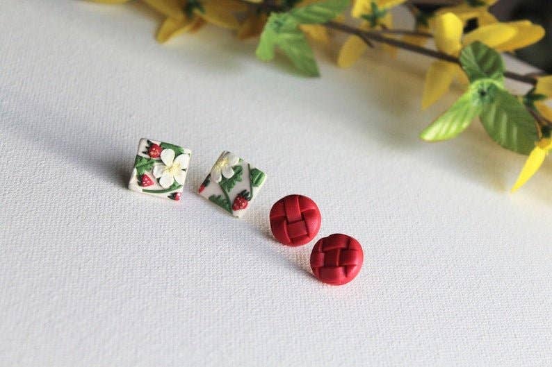 - Stud earrings are TINY! Length dimensions: 0.8 cm/0.31 inch - Hypoallergenic stainless steel studs and backs (kids can wear them too!) - Ultra Lightweight and comfortable - Brass bunny shape, polymer clay inside, glossy finish - Studs perfect for spring and Easter - Pack of three pairs of stud earrings PACK 1: yellow marble, pink marble, opal PACK 2: green, purple marble, white Handcrafted with love; every peace is truly handmade, starting with manually mixing colors, modelling the clay, sanding and assembling.
