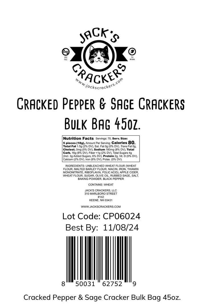 This is the alter ego of our original flavor. These crackers have a subtle flavor that works well as a palate cleanser and goes well with a bit of fresh fruit or preserves, cheese, prosciutto, or whatever else your heart desires on a cracker. This is a 45oz bulk bag for use in cheese plates, catering or any situation where you might need a mess o' crackers. Now available in our standard square or double wide sized crackers.