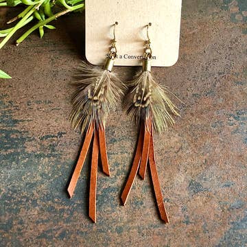 SKU: RG-E1121C Made in United States Color: Black and Brown Is Set: Set Material: Brass and Feather Occasion: Birthday and Christmas Style: Bohemian Theme: Nature Product Language: English Weight: 45.36 g (1.6 oz) Product Materials: Plastic-free and Upcycled Packaging: Recyclable and Recycled