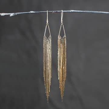 These dramatic earrings are incredibly soft to the touch. They look great with long hair, or make a stunning impact with short hair or an updo. Antique brass chains peak out between the feathers to add texture. Earwires are antique-brass. Goldfill earhooks available by request. Length ranges from 10" to 13" depending on available feathers. Coque feathers are sustainably sourced in the USA.