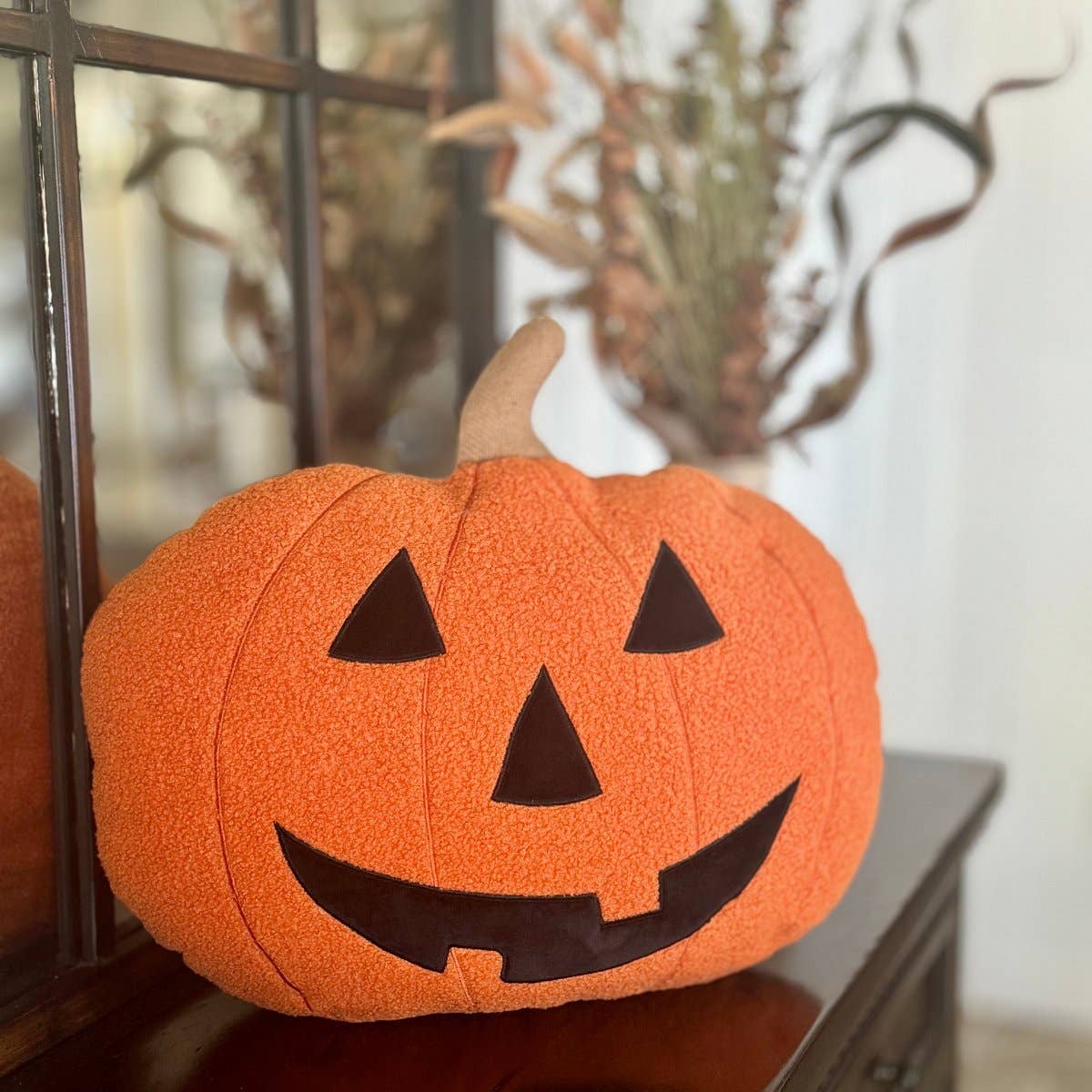 This Halloween, decorate your home with this fun and festive Sherpa pillow, featuring a spooky orange pumpkin pattern. Cozy and soft, this pillow will bring the spirit of the holiday into your home. Dimension approx (diameter): 17x17x15 (including stem)