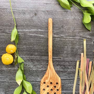 The spurtle is the most useful tool in the kitchen. Its perfect for sautéing veggies, stirring sauces and flipping pancakes and scrambling eggs. Olive wood is a hard wood making it very dense and durable for everyday use. Olive wood is nonporous so no germs or odors are retained. All products are made from a single piece of wood—they are seamless and no two pieces are alike.