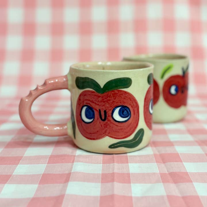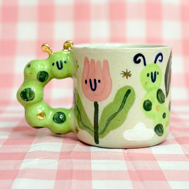 ring the serenity of an English garden to your drinkware collection with this handmade stoneware mug. Featuring a soft flower-shaped handle, delicate butterflies and doves, bright tomato accents with water droplets, and a curious caterpillar winding around the mug, each item is a whimsical miniature scene of nature. Perfect for tea, coffee, or quiet moments of daydreaming, it combines charm and functionality in one collectible piece. Material: Speckled stoneware ceramic with a partial glossy glaze finish and subtle gold lustre accents Size: Approximately 10 cm tall × 8 cm diameter Care: Hand wash recommended; safe on the top shelf of the dishwasher Ideal for boutiques, gift shops, and lifestyle retailers, this mug appeals to customers searching for handmade mugs, whimsical drinkware, nature-inspired ceramics, collectible mugs, and unique giftware. Shipping: Each mug is made to order, please allow 4–6 weeks for delivery.