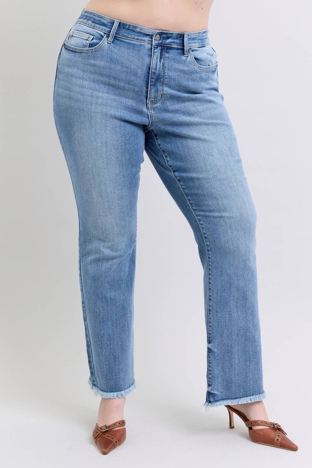 Our Mid Rise Distressed & Fray Hem Bootcut jeans by Judy Blue Jeans are a testament to our commitment to quality and comfort. These jeans are perfect for the contemporary woman seeking a casual, everyday style. Crafted from a blend of 94% Cotton, 5% Polyester, and 1% Spandex, these jeans are designed to provide a comfortable, regular fit. The light wash gives them a casual vibe, while the distressed and frayed hem adds a modern twist. Ideal for spring/summer, they can be hand washed for easy care. With a front rise of 10 3/4" and an inseam of 32", they offer a flattering fit. Experience the Judy Blue difference today. Rise: 10 3/4" Inseam: 32" MODEL INFO - Wearing a Judy Blue Size: 1 Height: 5'8 Waist: 25" Hips: 36" Due to different screen settings, actual color may vary slightly.