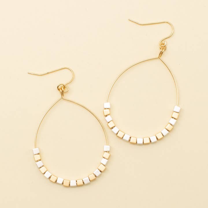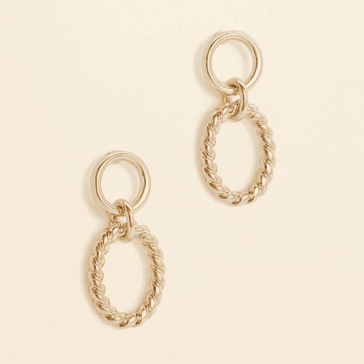 -Natural woven coin stud with natural drop detail -3” long