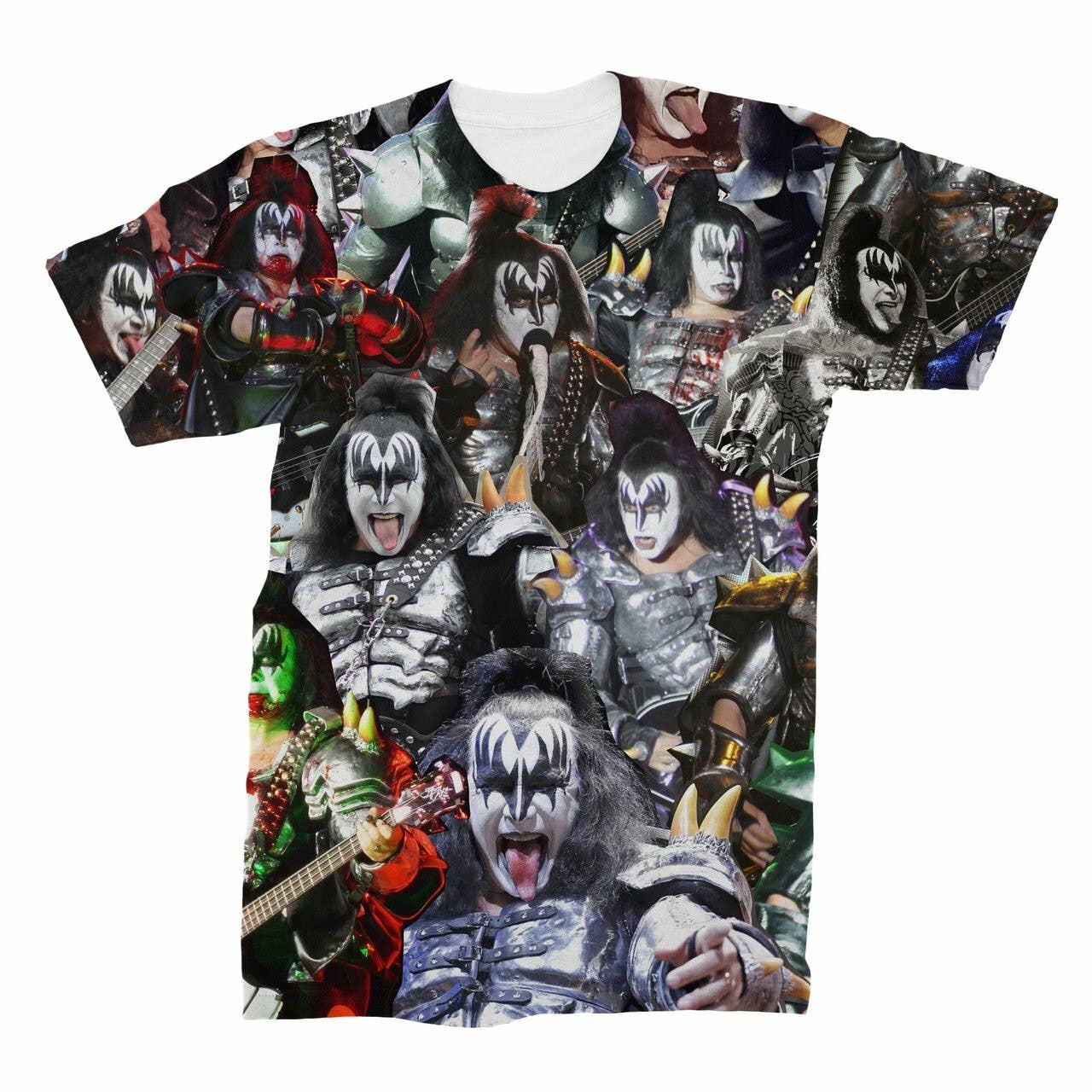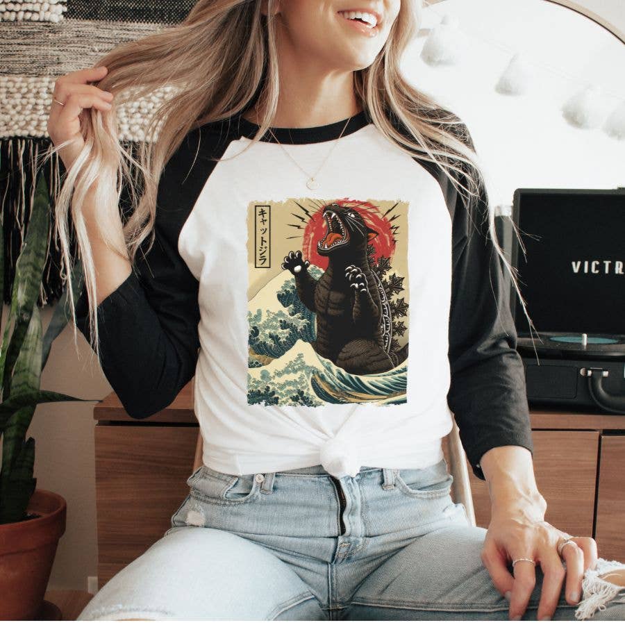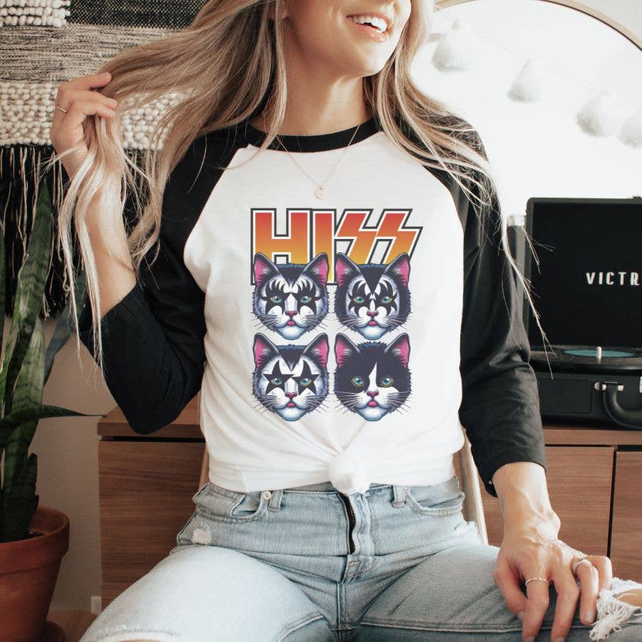 Hiss Parody Rock Band Raglan 3/4 Sleeve Shirt A soft white shirt with black 3/4 length sleeves, with a vibrant direct to garment (DTG) printed design. These shirts are unisex and offer a comfortable fit for men and women. Printed in North Carolina.