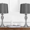 This sleek set of modern metal table lamps by Grandview Gallery cuts an eye-catching figure. With their curvaceous hourglass silhouettes and gorgeous finish, these lamps add sensuous class to any room. Each lamp is crowned by a matching metal finial and a tapered drum shade wrapped in a luxurious fabric. Whether resting on your nightstands, set on side tables in the den, or tucked into your favorite reading nook, these lamps are the modern, chic solution to your lighting needs. Set of two lamps, each is 27" tall. Round bases are 7" wide. Hardback tapered drum shades are 13" at their widest and are 10" tall. Each lamp uses one 100-watt maximum "A" bulb (not included) and features an E26 socket with a 3-Way switch.