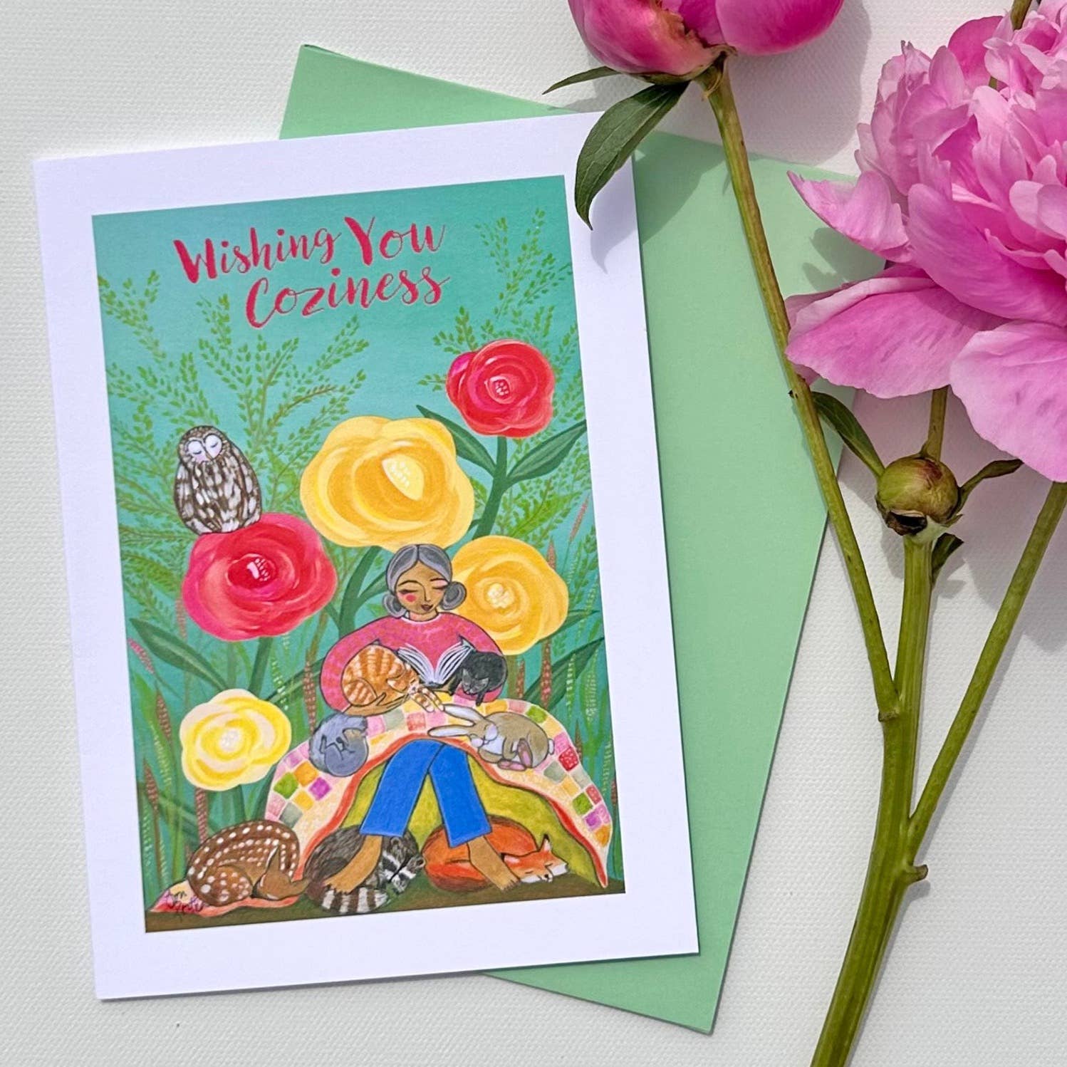 Show you care with a sweet doe. Single card with cream envelope. Measures 5" x 7" folded, blank inside for your own message. Printed on FSC certified paper, envelope 100% recycled, "plastic" sleeve is compostable. There will be no watermark/logo on your card!