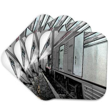 This coaster features our Chicago El Train design. Multi-functional little art pieces make great gifts, and are a great size (and price) for buyers. This design is perfect for Chicagoans and tourists alike. * Powder blue glass, printed in black and red glass enamels * 4" square, with rubber bumpons on bottom * Dishwasher safe * Handmade in the USA Coasters are screen printed, fused glass. Glass is cut, and screen printed by hand with fine glass enamels, then fused overnight to 1415 degrees in a kiln. Each piece is made by artist Laurie Freivogel in her Oak Park studio. This design is part of a series and has other matching housewares!