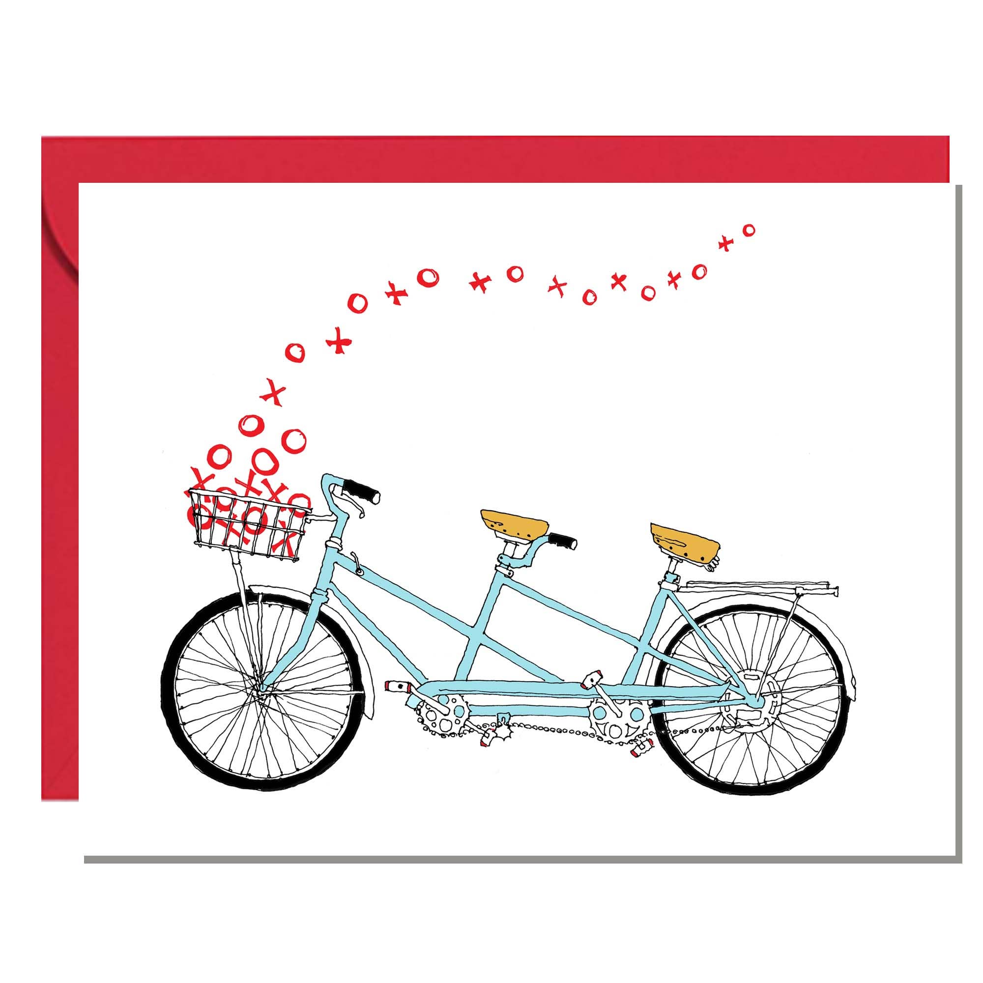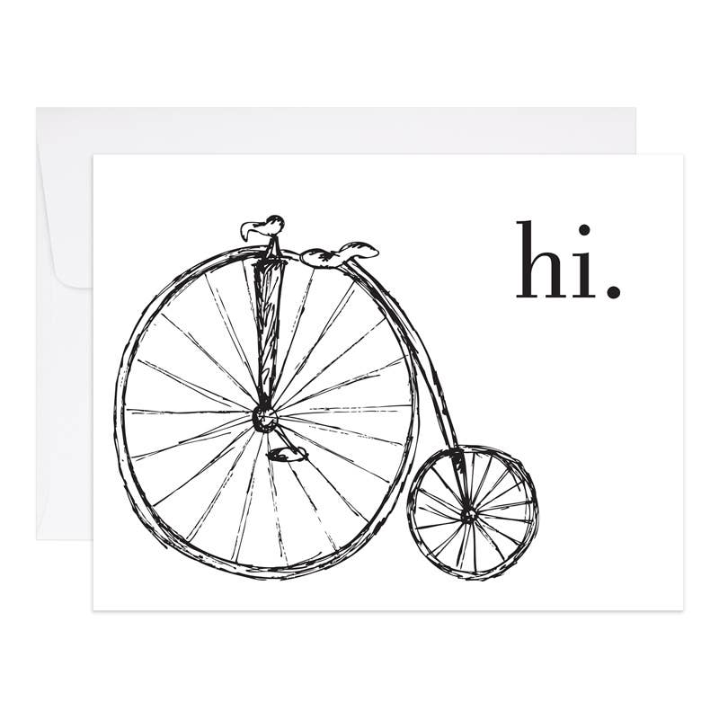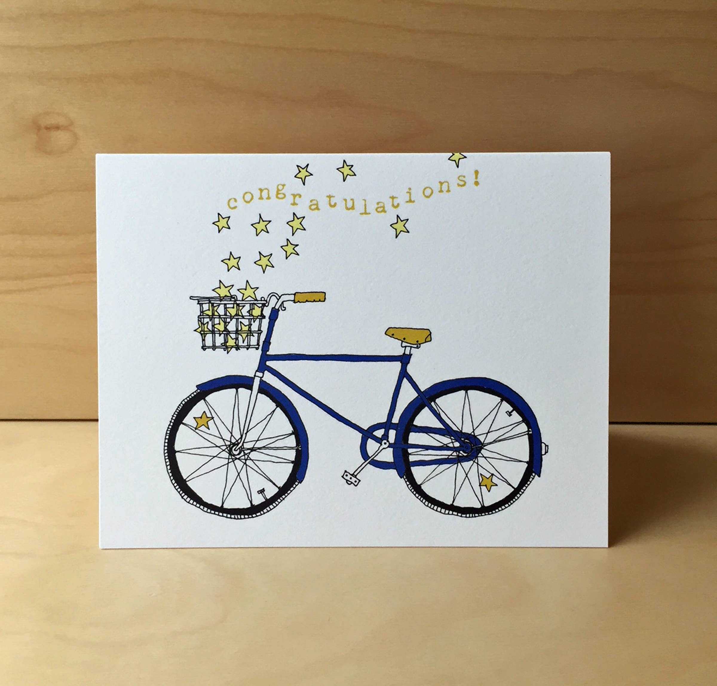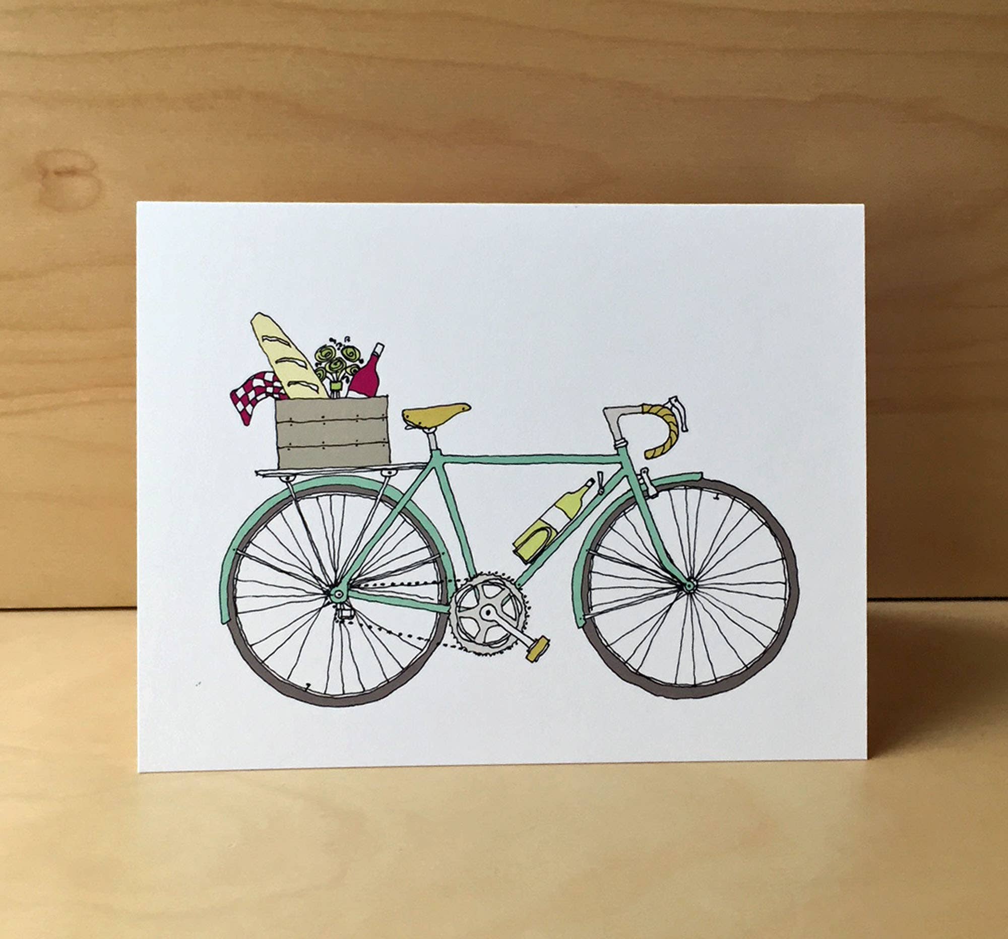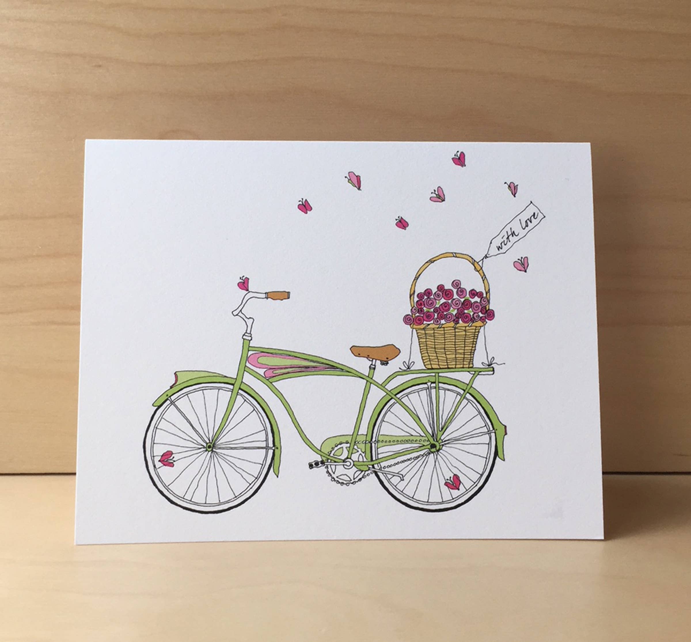 This happy bike is riding into springtime with its flower spokes and basket full of tulips. My hand-drawn image is scanned and digitally colored. Professionally printed on super heavy ultrawhite 120# paper. Size A2 5 1/2" wide x 4 1/4" high. Pink envelope. Card is blank on the inside.