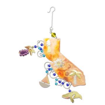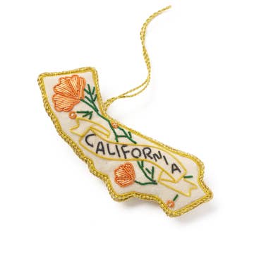 This hand-painted blown-glass ornament is inspired by the beloved 1913 sheet-music cover for California’s official state song, “I Love You, California.” Featuring the iconic bear lovingly embracing the Golden State, it brings a touch of vintage charm and California pride to any holiday tree. Measures 2.5" x 4.5" and comes gift boxed. MSRP: $18.95 Minimum order: 4
