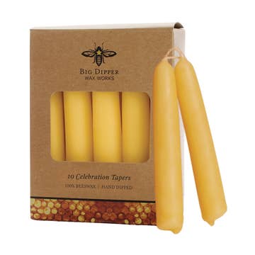 Mole Hollow Candles 8" beeswax taper candles are made of only 100% USA-sourced beeswax and 100% cotton wick. Each candle is hand dipped using a technique that has been in place since our founding in 1969. Our natural beeswax tapers are a year-round bestseller. Tapers are sold in cases of 6 pairs. Per pair price is displayed. • Each pair is connected at the wick + labeled for individual sale • 8” height, 7/8” diameter • Sized to fit a standard candlestick • Each taper burns for approximately 6 hours • Dripless + smokeless when burned under normal indoor conditions • Hand dipped in Sturbridge, MA