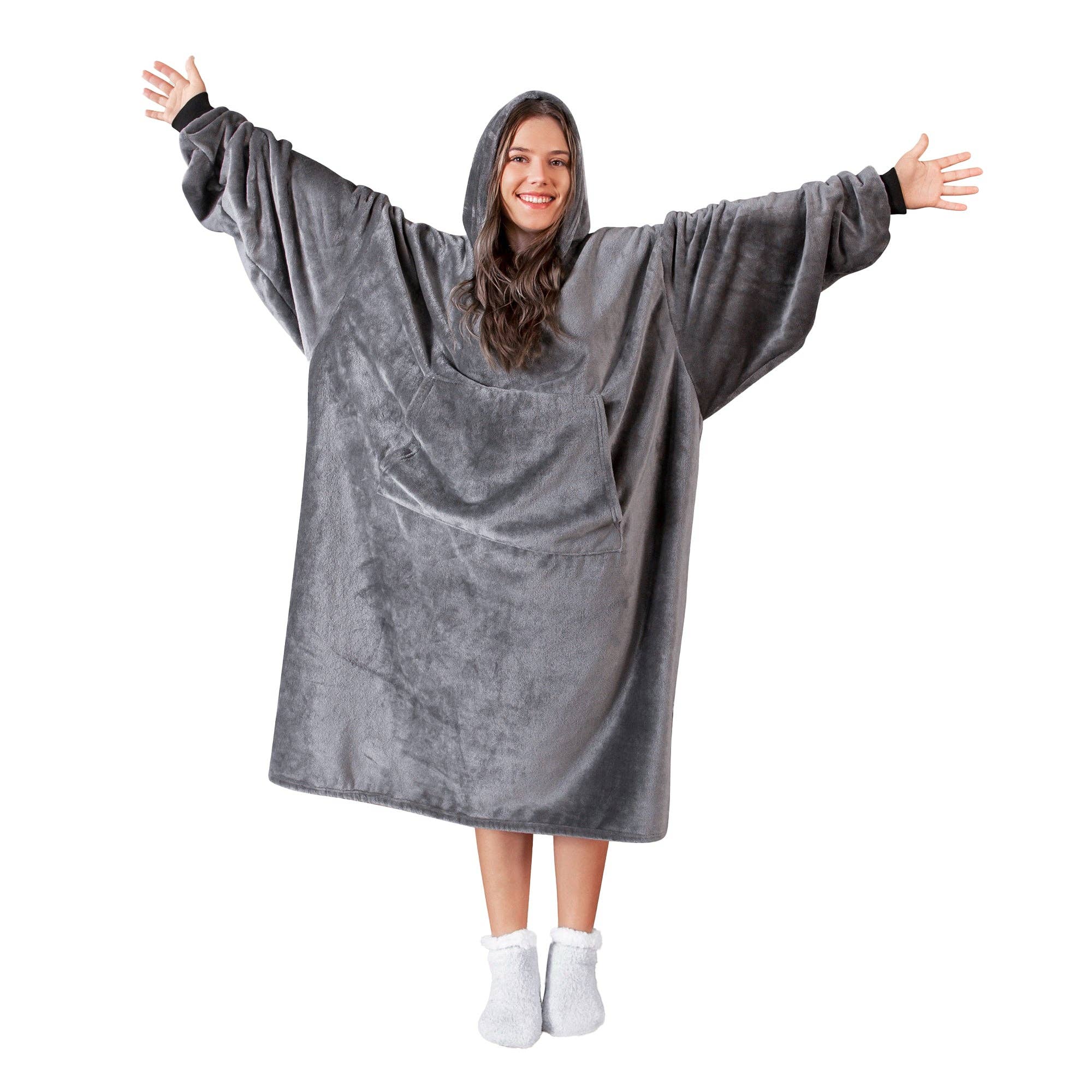 Hate having to get up and leave the warmth of a throw behind? Now you can wear the same super soft plush patterns you love while staying warm throughout the house! These hooded blankets are extra large to fit everyone with elastic sleeve cuffs and a kangaroo pocket. * One size * 48" x 37" laying flat, not including the hood * 23" long sleeves * Machine wash warm, tumble dry low