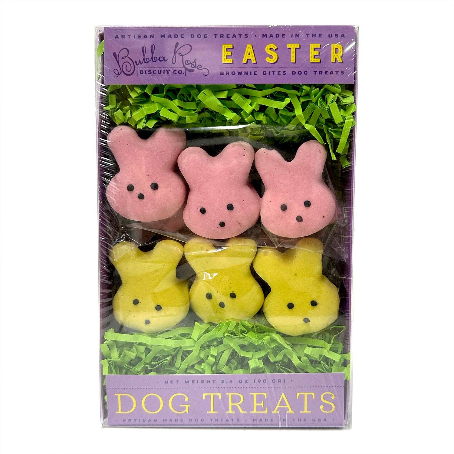 Our high quality, wooden display crate is available for free with the purchase of 12 clear boxed treat sets. We made this one a no-brainer and created the set of 12 spring boxes for you. Colors can be assorted. This crate set includes: 1-Wooden Display Crate 4-For My Sweetie boxes 4-Pint of Gold boxes 4-Eggstravaganza boxes Crate size: 6.25" x 9.5" x 2.5" No substitutions with this set. Limit 1 crate per store. - All Natural & Preservative Free - Healthy & simple ingredients - Wheat, corn, soy & gluten free - A portion of all sales goes to the Bubba Rose Foundation, a 501(c)3 charity to help the local stray dog population Ingredients: oat flour, rice flour, peanut butter, eggs, carob and honey. Topped with yogurt coating (yogurt powder, non fat milk powder, modified tapioca starch, egg whites, tapioca maltodextrin, apple pectin, potato starch), vegetable coloring and carob.