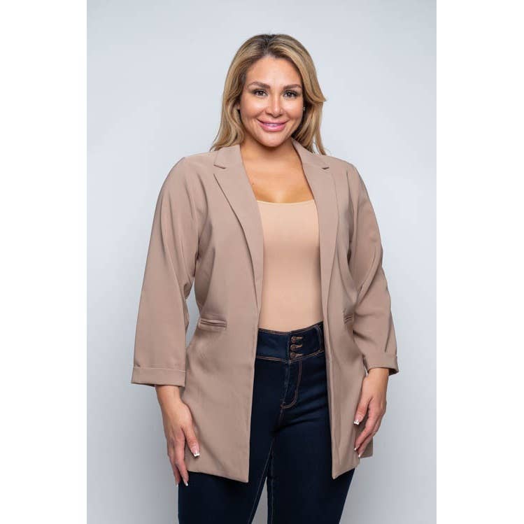 Casual, solid, waist length, blazer jacket in a fitted style with a draped open front, and ruched 3/4 length sleeves. A casual solid waist-length blazer jacket is a versatile and stylish piece of clothing that can elevate any outfit. The jacket typically features a fitted style that contours to the body, creating a flattering silhouette.