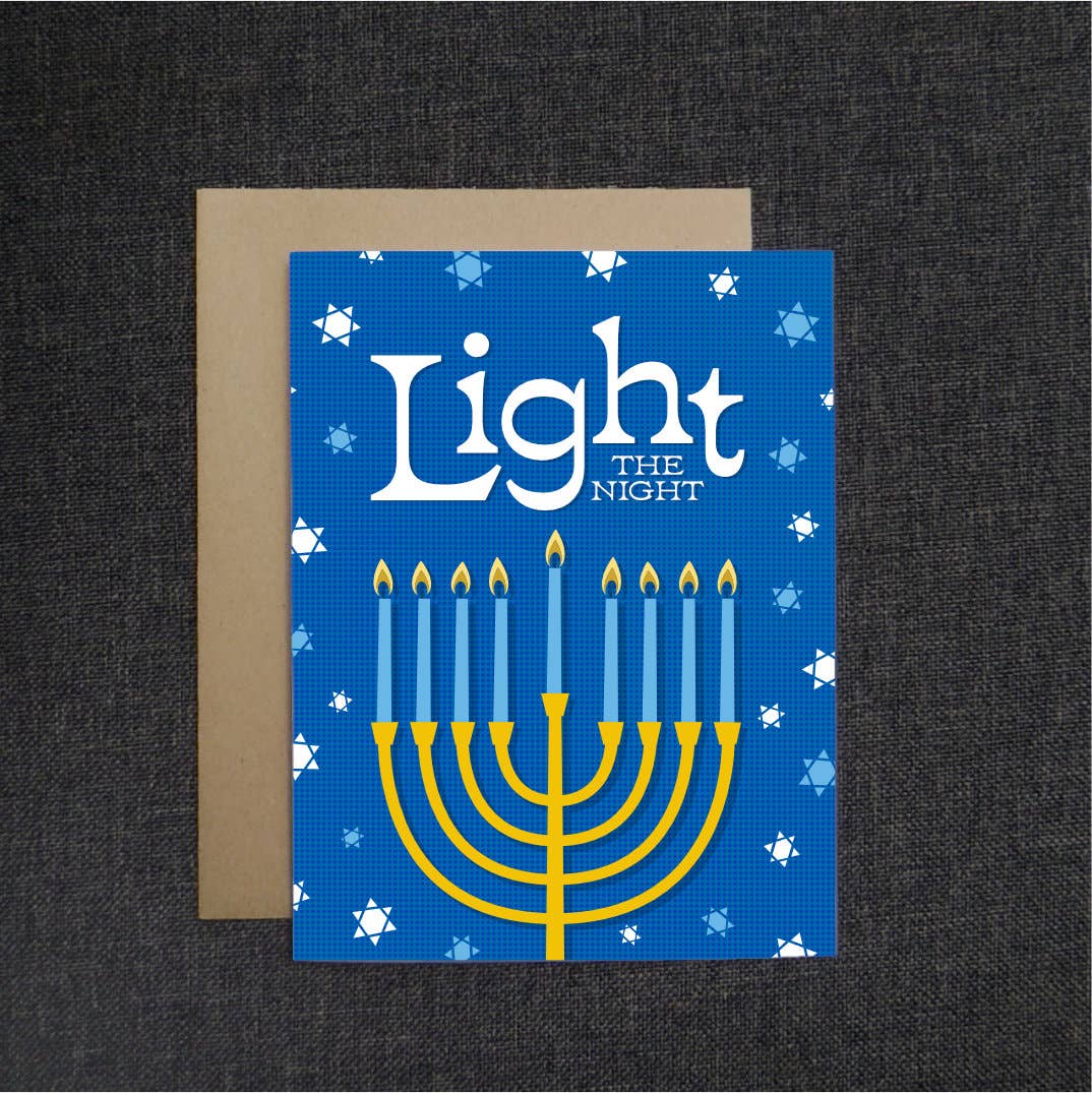 The perfect Hanukkah card for the feminist friend/family. A2 size card (5.5 X 4.25 in). Blank inside. Paired with kraft envelope. Printed on 100lb heavy bright white matte card stock. Each card is packaged in cello sleeve to ensure protection. Note that actual colors may vary slightly due to differences in screen settings. Made in Maryland - all designs are done by Tyler Jones, printed, cut and packaged in-house.