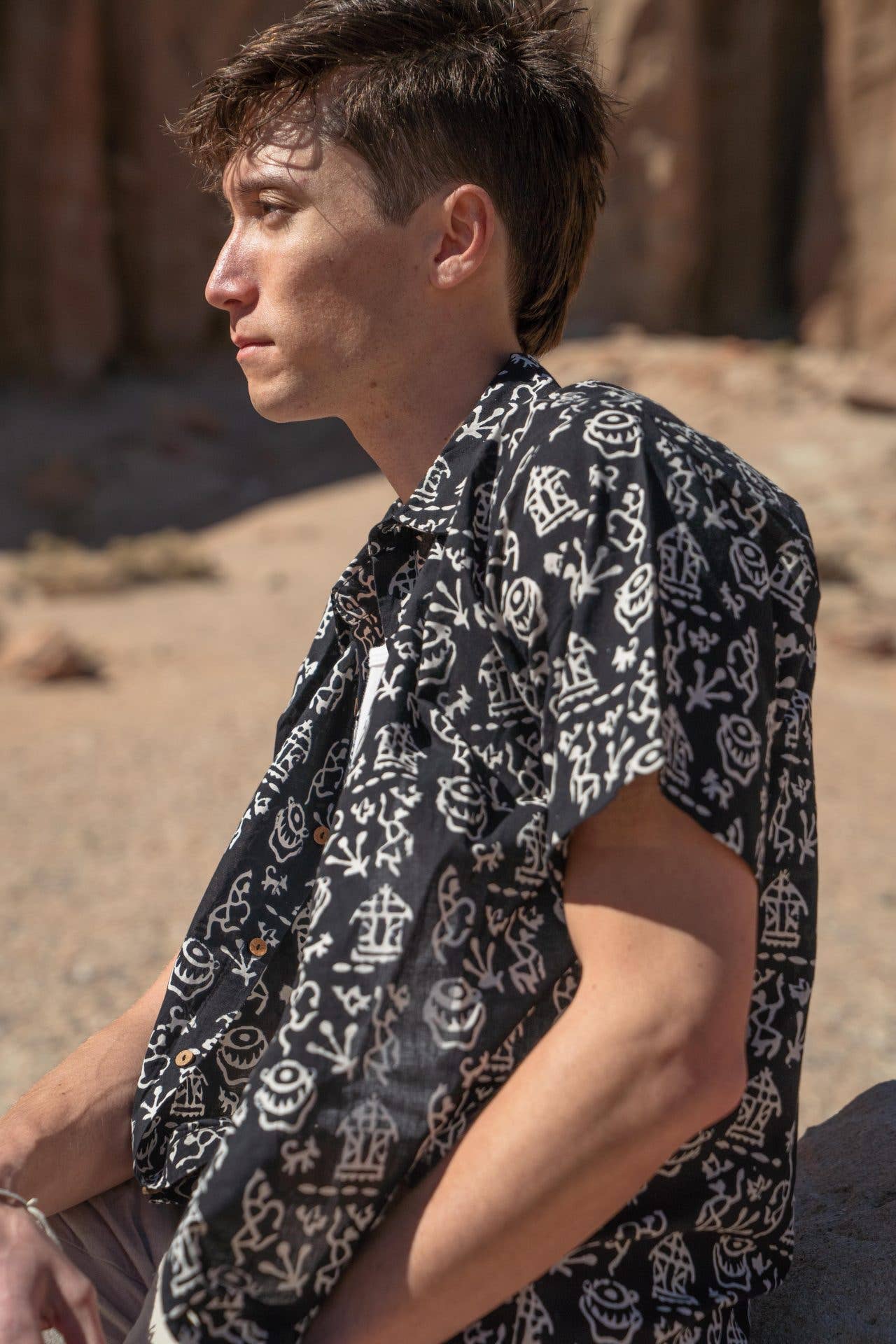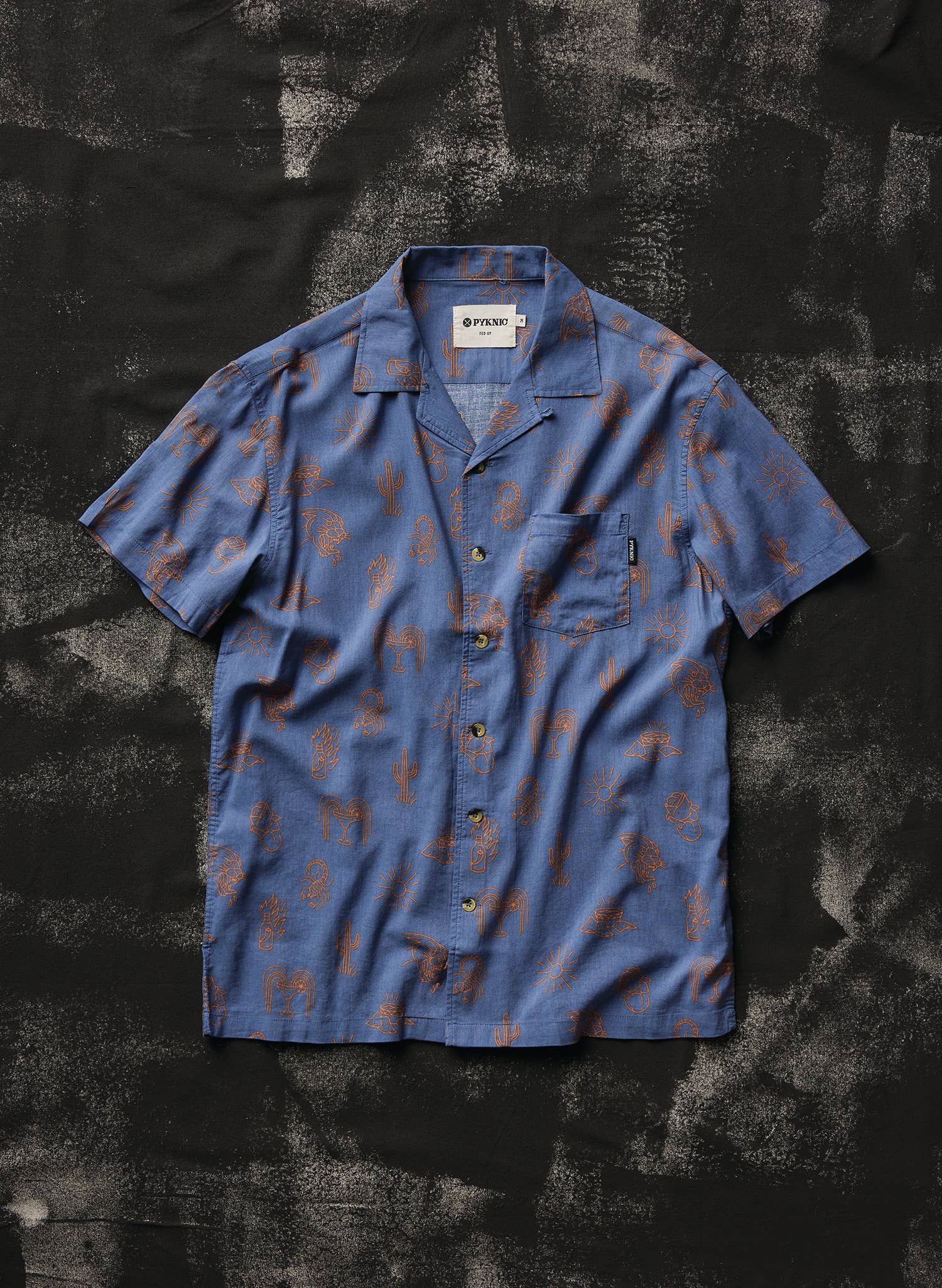 SKU: NPM-338-BLK-S Made in China Aesthetic: Retro / vintage and Streetwear Color: Black Fabric: 55% Cotton 45% Rayon Fit: Contemporary and Unisex Neckline: Collared Occasion Theme: Cinco de Mayo, Day of the Dead, and Everyday Occasion: Everyday Pattern: Graphic Season: Core Sleeve Length: Short Sleeve Weight: 113.4 g (4 oz)