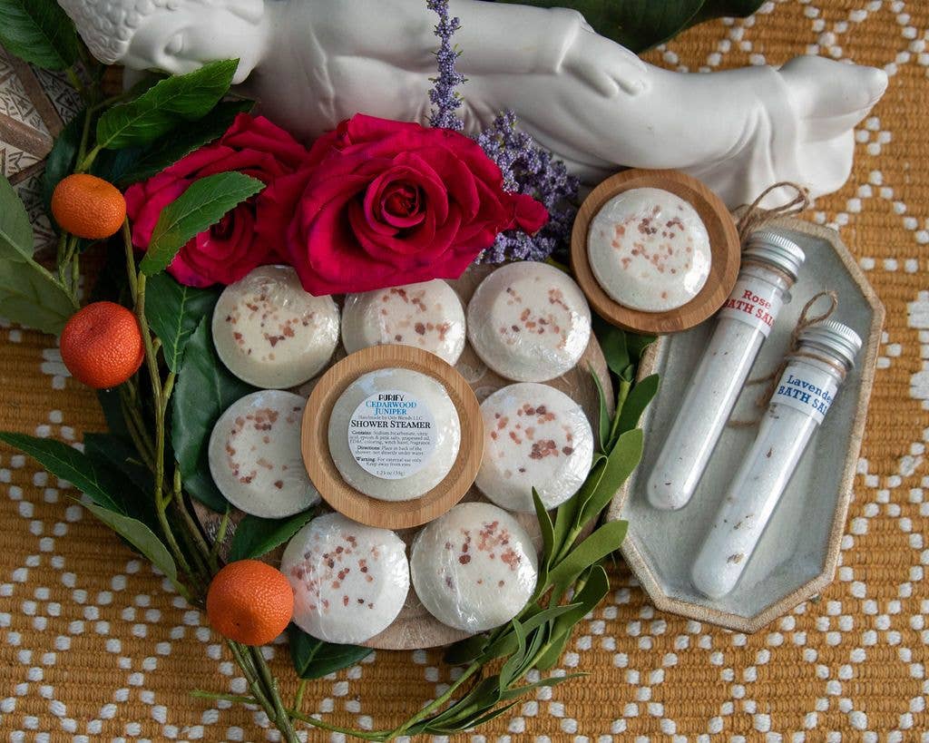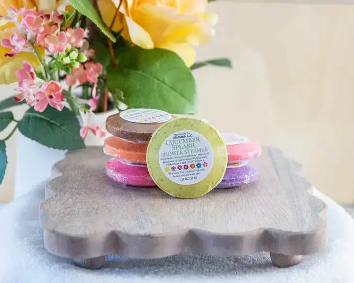 Celebrate Shower Steamers are individually shrink wrapped, with a label on the bottom with details and ingredients. Steamer Trays come separately. Lemon Creme Cake (Yellow) - The scent of bright lemon peel, juicy lemon, creamy butter, sugar, and vanilla Directions: Place the steamer in the back of the shower, not directly under the shower spray, but where it will still get splashed by the hot water. Shower as long as desired. Extend the life of your shower steamer with these wooden shower steamer trays.