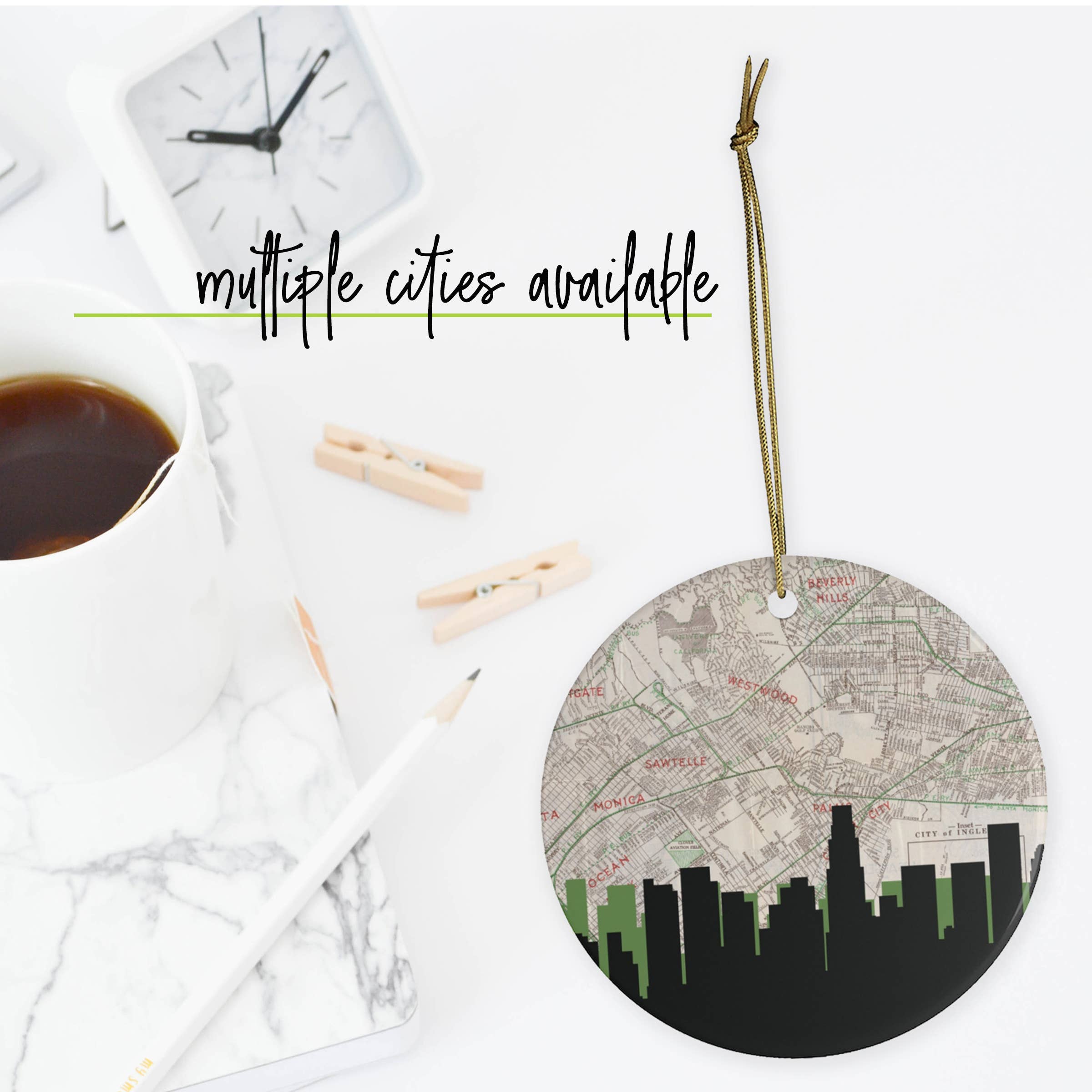 Introducing brand new Christmas ornaments! Available in over 400 U.S. cities, our bestselling city skyline design is printed edge-to-edge on these ceramic Christmas ornaments. If you don't see your city in the dropdown, just ask - we probably have it! GIMME ALL THE DETAILS: Ceramic ornament with design on one side | 2.85” diameter | 100% Made in the USA | Gold string included |