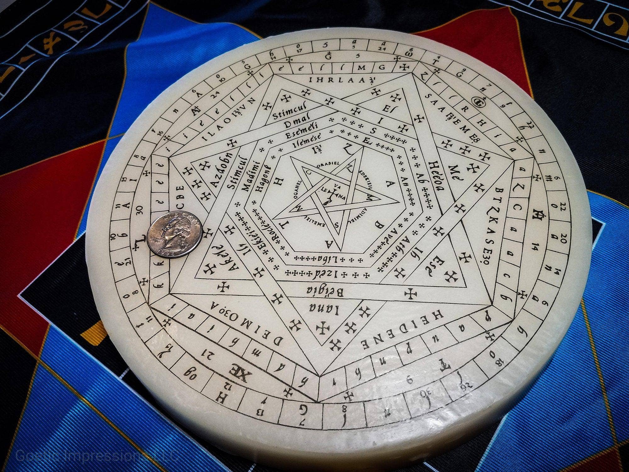 The central item in any Enochian working, the four Elemental Watchtower Tablets were received by John Dee and Edward Kelley from the Archangel Raphael. At Goetic Impressions we used the Reformed Great Table of Raphael for our Enochian Watchtower tablets, and painstakingly went over every detail against the original surviving diaries to ensure the maximum accuracy to the rituals of the Enochian system. Each tablet is gold plated and infilled with hard enamel, with colors corresponding to the elemental properties of each section of the Watchtower tablets. On the back of each tablet is the Watchtower symbol associated with that particular quarter of the Great Table. The names of the Enochian angels are encoded within each tablet, and during a proper working of the Enochian system can be called upon for knowledge or aid by the adept. Features * Measures 3" x 3.25" * Gold Plated * Hard Enamel Options The Hard Enamel Tablets comes in two grade options, Adept and Initiate. * Adept: Premium quality Tablet with minor to no blemishes. * Initiate: Tablet with minor to moderate blemishes. These will still hold up well to rituals. **Full Set: Only Includes Watchtower Tablets Tablet of Union Sold Separately All of the Goetic Impressions Enochian tools are made to be as accurate as possible to the Enochian system transmitted to John Dee and Edward Kelley by various angels and archangels in the late 1400s. We have painstakingly poured over the surviving diaries and accounts in order to bring you the most accurate ritual pieces we can, while still keeping each piece within budget for the average practitioner. Explore more Enochian tools