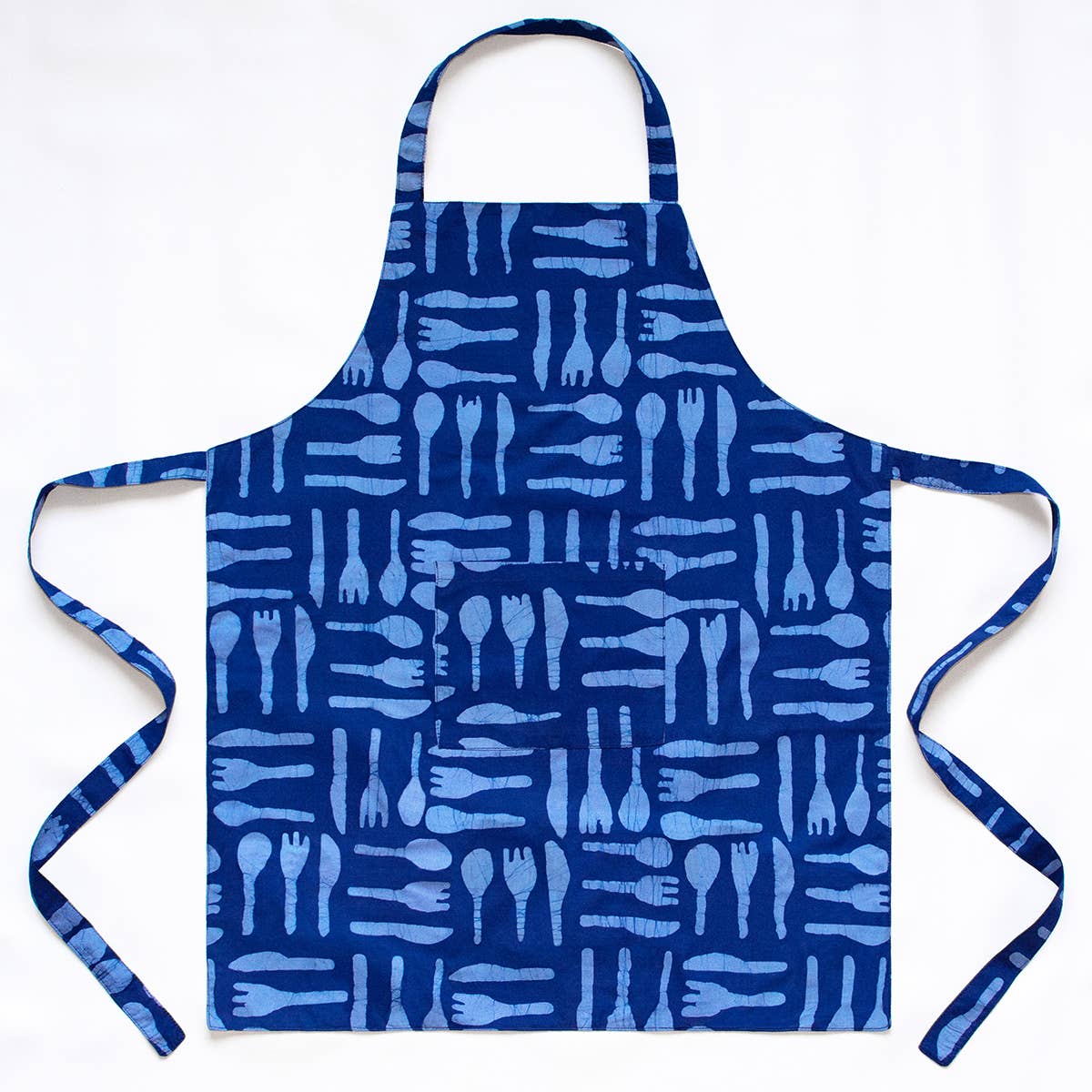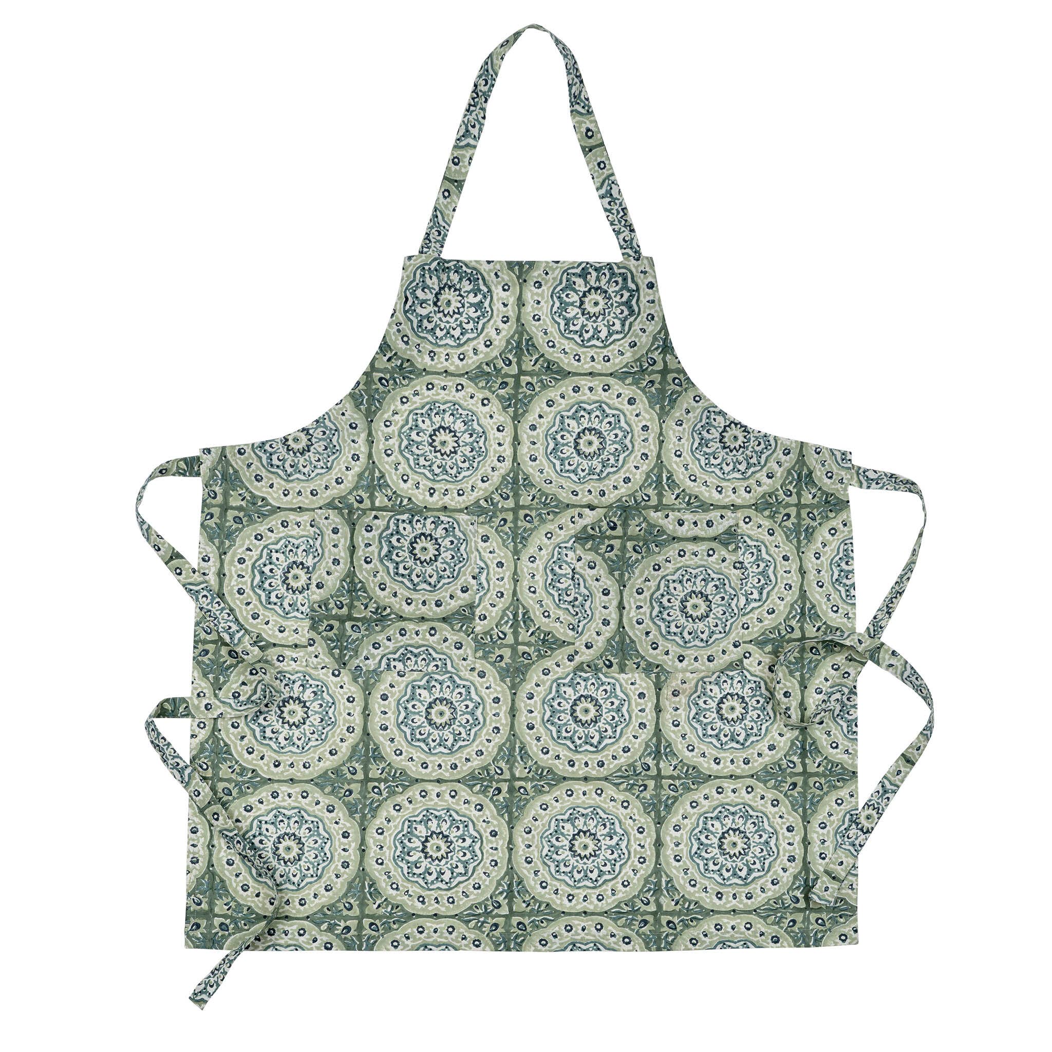 Adult apron: natural canvas back, single pocket, featuring a screen-printed pattern