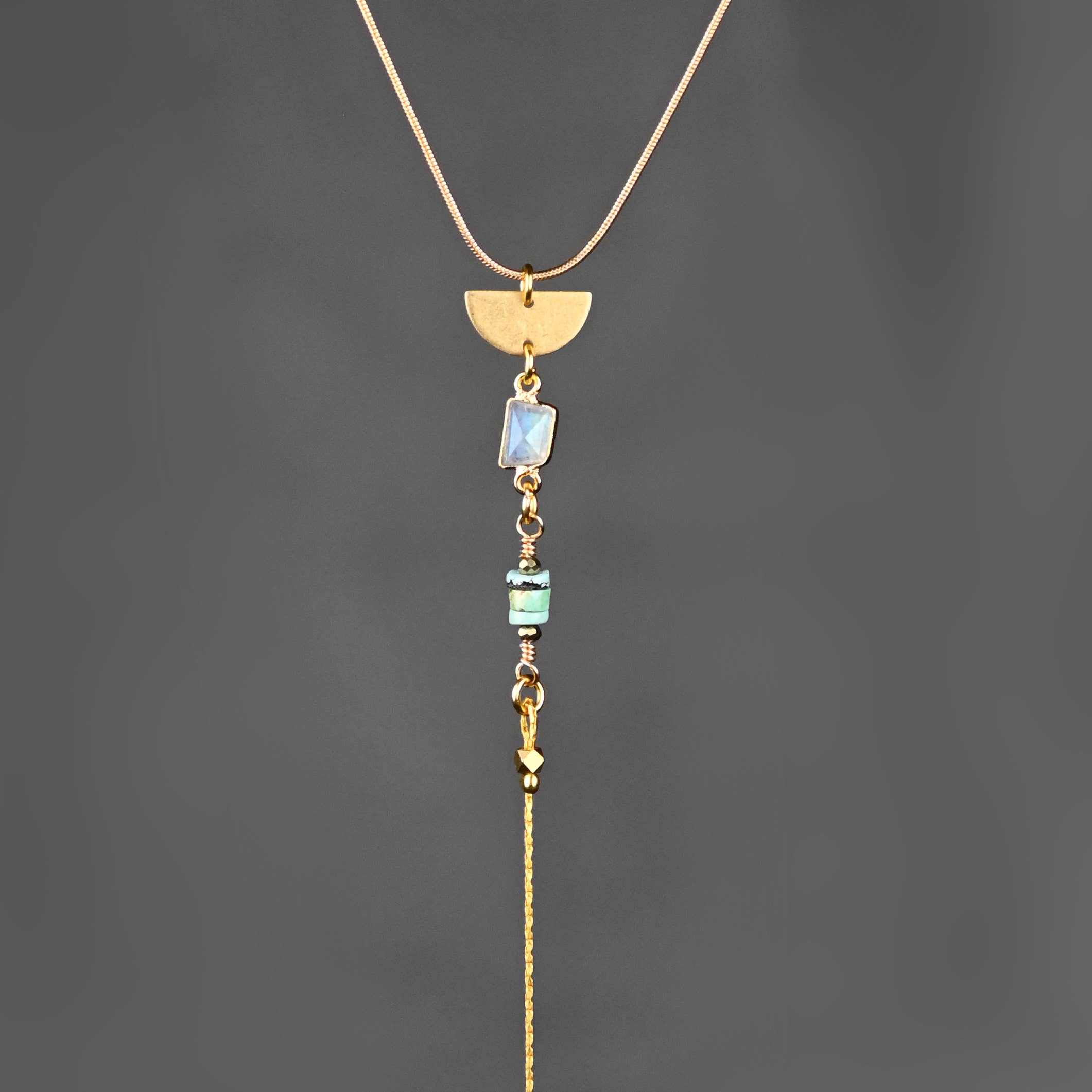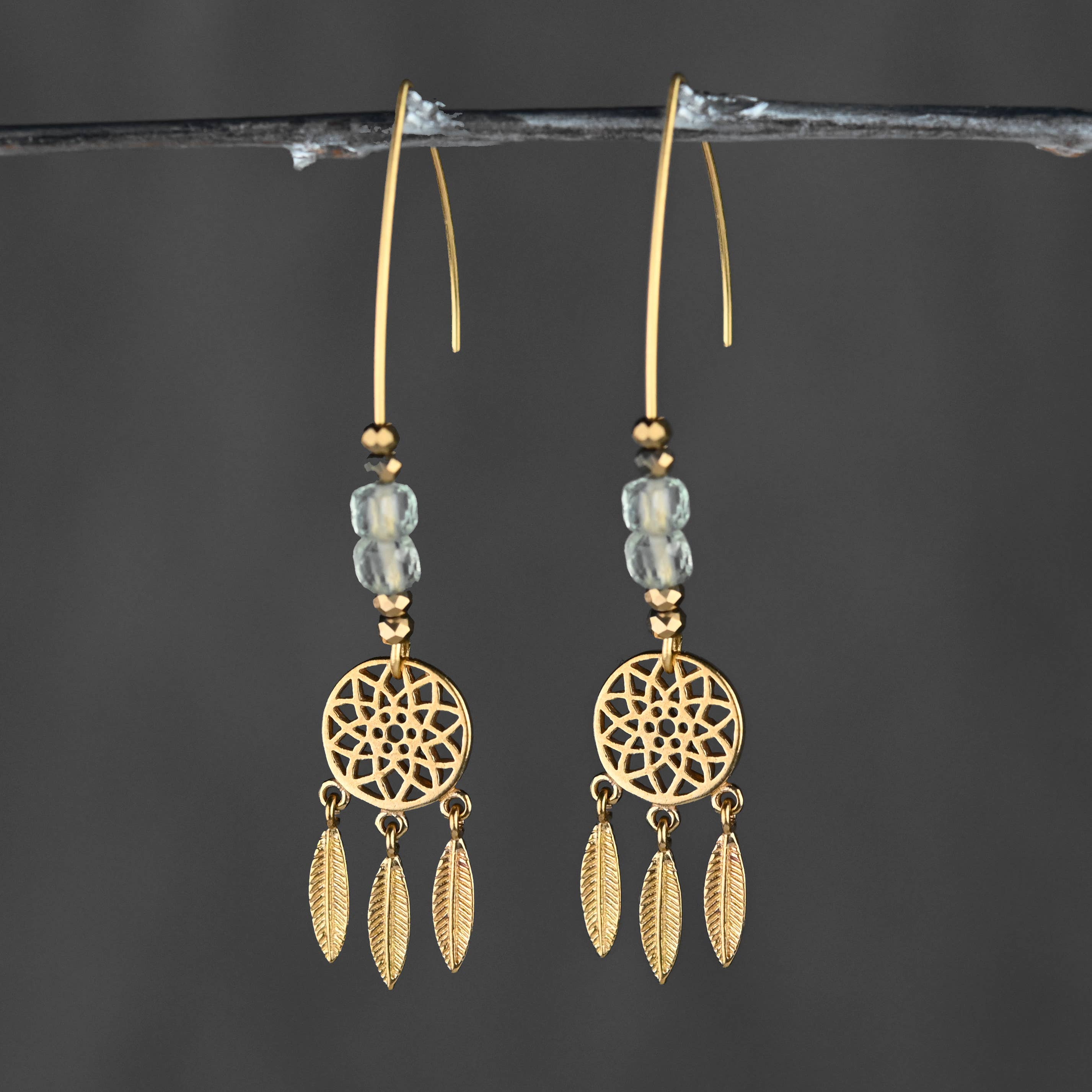 A great pair of earrings with a pop of turquoise, gold crystals & and hammered brass triangles. Turquoise Jasper is said to help find inner peace and release stress. They appear bright turquoise in color. Metal: Brass Size: Approx 4” Handmade with Art & Soul