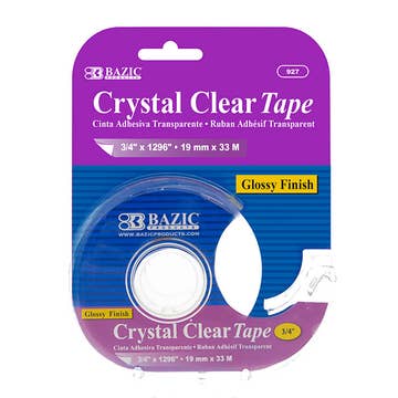 GLOSSY-FINISH. This self adhesive tape is designed in transparent and will not affect the appearance of surface. Delivers a strong bond on contact. Keep contact surfaces clean and dry before stick on. GENERAL PURPOSE. Comes off the roll smoothly, cuts easily. Perfect alternative to messy glue. Permanent paper mending. UNIVERSESize. Each Tape width is 0.75 inch (18 mm). The 1-inch inner core is suitable for most round and square desk tape dispenser. BAZIC also offer refills tape in matte, clear, crystal color. VERSATILE. Crystal Clear tape is great for office paper works, school projects, label protection, arts, crafts design, gift wrap, cards, ribbon, boxes, repair, packing, sealing, bonding, etc. FAST & SAFE. Acid free. Provides safety to kids and elderly by using stationary tape instead of toxin glue. Its thin profile enables you to not feel that there is anything.