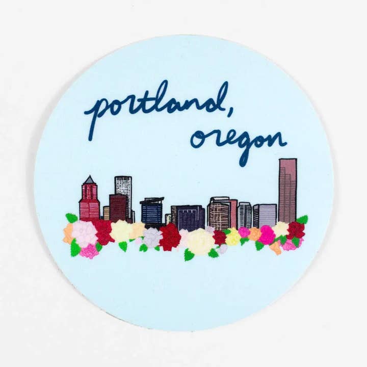 This listing features various Portland-themed keychains that depict illustrations of the iconic Rose City. Options include: Portland skyline - rendered in two shades of green. Set against a light green background, this keychain features an outline of the iconic buildings and Hawthorne bridge in dark green. Above the scene is a green and yellow banner that reads Portland. Portland Donut - a light pink keychain with a pink frosted donut with a bite taken out of it. There are hot pink ribbons both above and below the donut that read: Portland Oregon. White Stag - an ode to the iconic sign, this dark green keychain features a new version illustrated in yellow and white. The keychains are double sided with matching illustrations and encased in plastic.