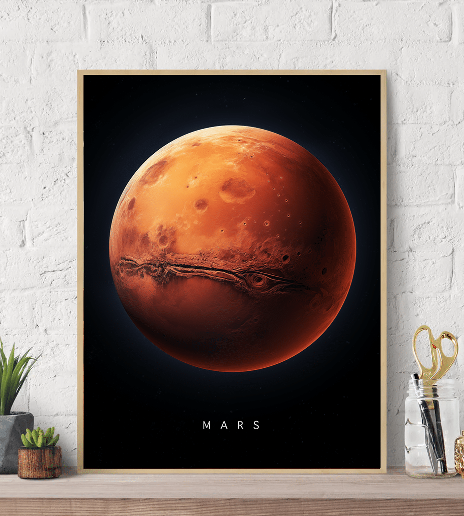 Print to order. May take up to 15 days to ship. Orders that contains Prints will be split from other items and will be shipped separately. • Each print comes in a tube • Print size: 18” x 24” • Material: Canvas • Frame: not included The planet's iconic features, such as the Valles Marineris—a system of canyons stretching across its equator—are rendered in exquisite detail, inviting you to ponder the geological forces that shaped this alien world. The artwork is suffused with the warm glow of the Martian atmosphere, contrasted against the profound darkness of the surrounding cosmos.This print is perfect for those enchanted by the wonders of space exploration, science enthusiasts, or anyone who appreciates the beauty of the cosmos. It will transform any space into a window to the universe, inspiring awe and curiosity about what lies beyond our own planet. Add this stunning piece to your collection and let your clients travel to Mars from the comfort of their