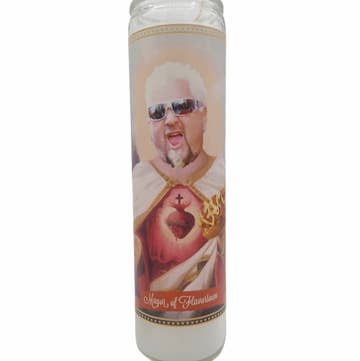 Tall white candle, hand poured in Mexico, design and assembled in the USA. Candle is unscented. Guy Fieri inspired parody art prayer candle.
