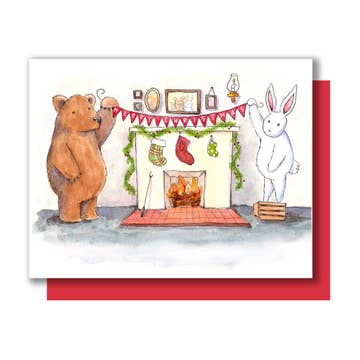 "Warm & Fuzzy Christmas Wishes" handlettering above a chubby chipmunk wearing a sweater illustration. Original watercolor illustration printed on 130 lb paper Set of 8 cards comes with 8 deep-flap red paper envelopes in a plastic box Size: 4.25" x 5.5" A2 card
