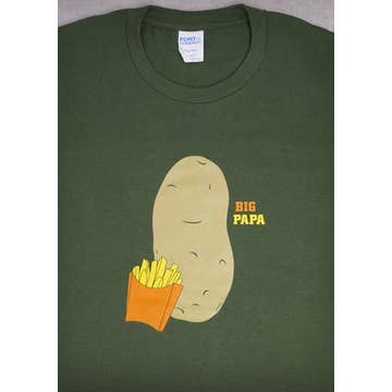 Here's a fun daddy graphic t-shirt from 24-7 Daddyhood for the big guy that has a lil guy who's a chip right off of his block. Er...or a fry, to be more exact. We all come from somewhere, and it's no big shock that small fry here is cut right from his big papa. So celebrate this familial legacy with these fun and humorous graphic tees from 24-7 Daddyhood. And for bonus points, who here knows how to say "potato" in Spanish? Serve 'em up hot, Daddio.