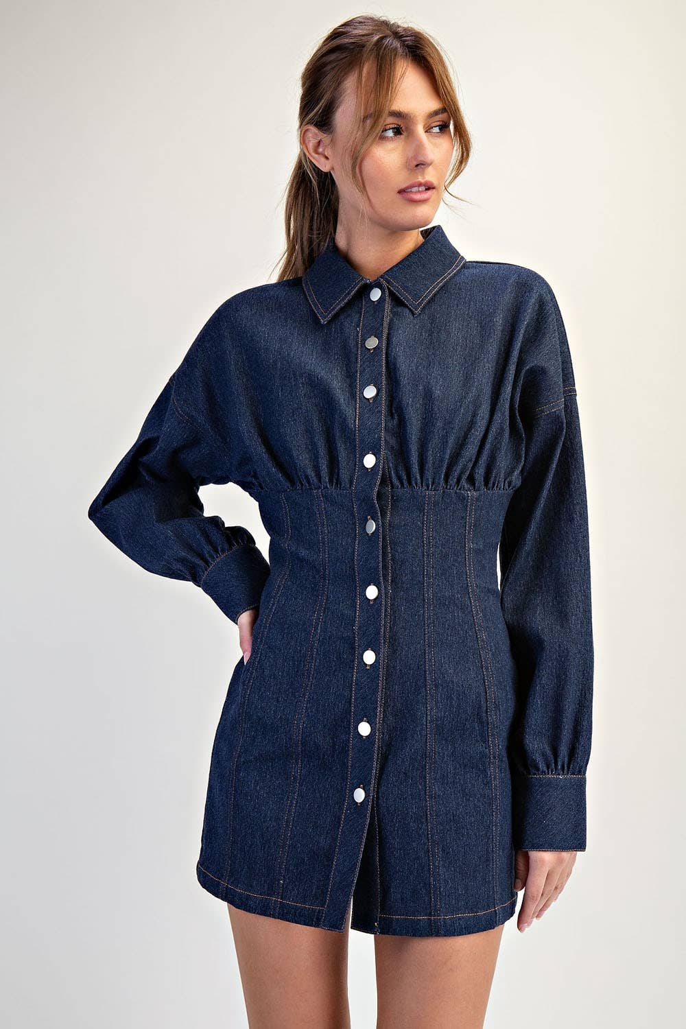 SKU: LD5007-BLUEDENIM, LD5007-BLUEDENIM, LD5007-BLUEDENIM Made in China Aesthetic: Casual and Classic Care Instructions: Hand wash Dress Style: Baby Doll and Shirt Dress Embellishment: Ruffles Fabric: Denim Fit: Contemporary Neckline: Collared Occasion Theme: Everyday and Fourth of July Occasion: Everyday and Work Pattern: Solid Season: Pre-Fall Skirt & Dress Length: Mini Sleeve Length: Long Sleeve