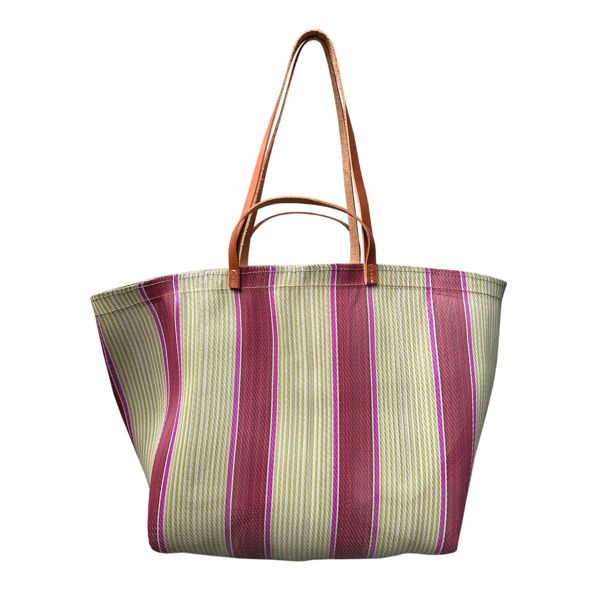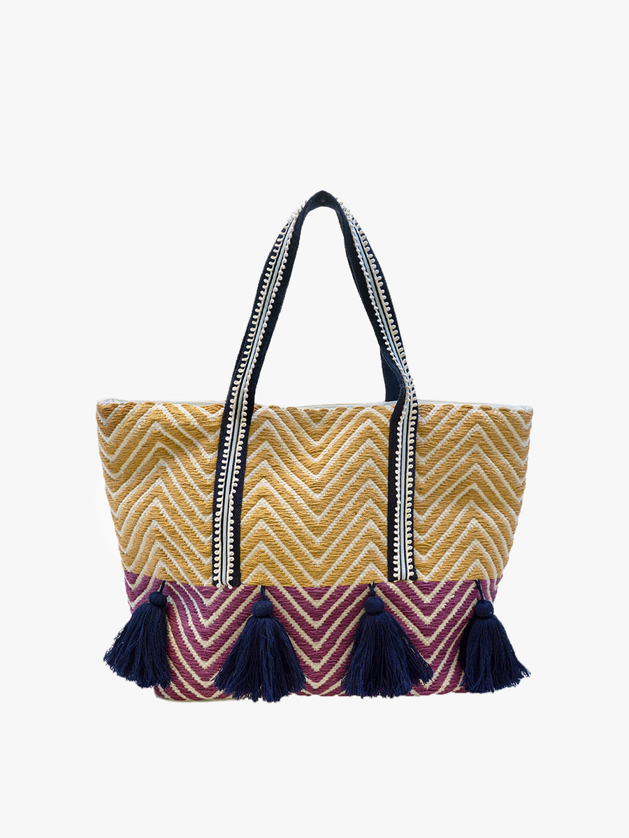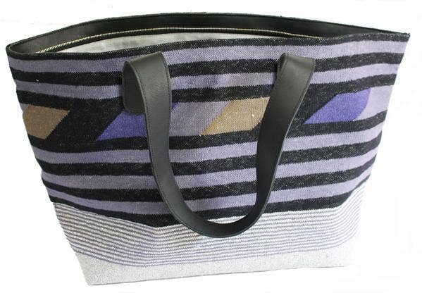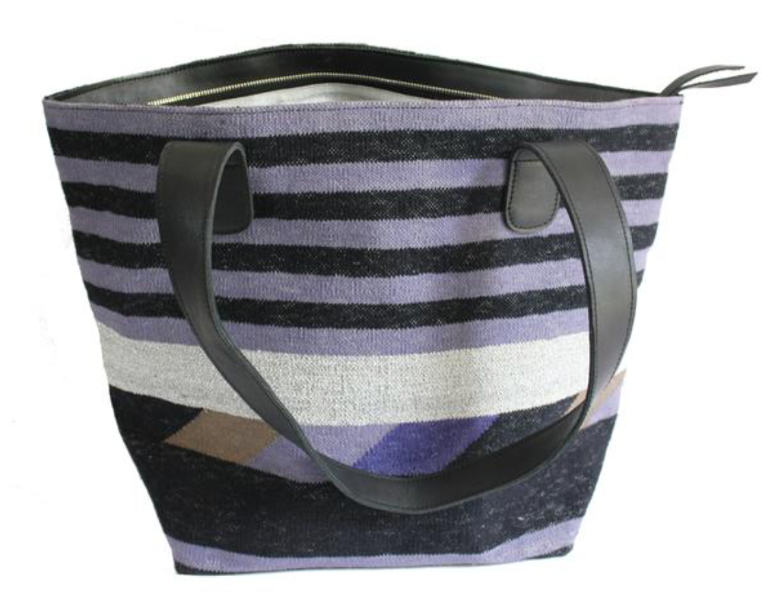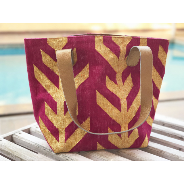 Dimension: 23" x 15" x 8" 32" leather handle. Zip top. 2 open pockets on inside with zip pocket opposite. Leather bottom. Made from 100% cotton hand-woven dhurrie rug. Magenta cotton lining. Gold leather detail.