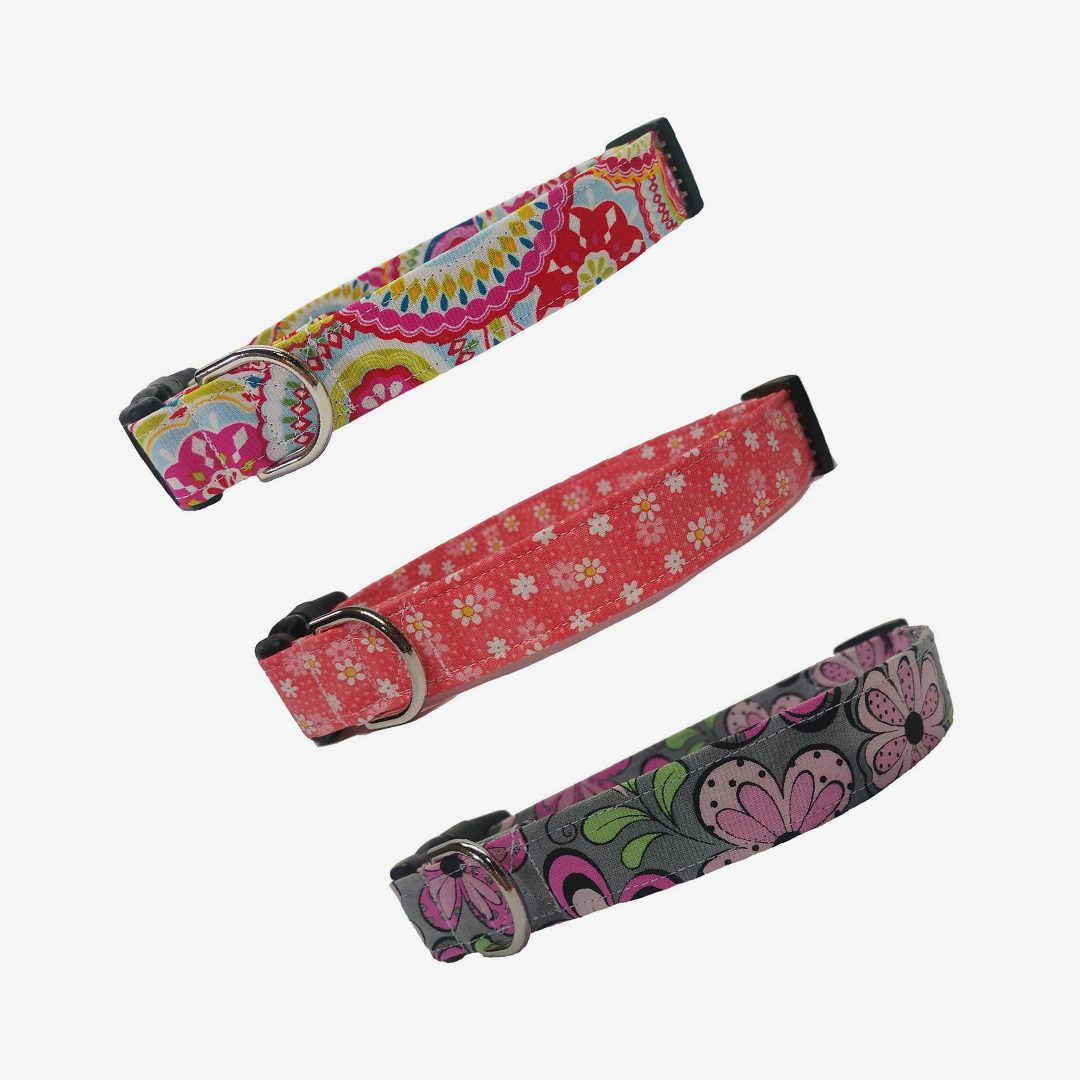 Handcrafted dog collar made with sturdy materials for washing and selected quality cotton fabrics. Collar feature plastic quick-clip buckles to quickly and conveniently remove the dog collar. Leashes are made of cotton with durable interfacing and snap hook.