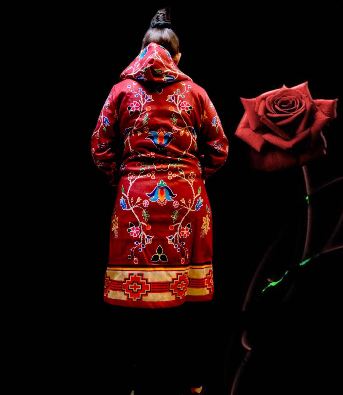 * Design & Style: Unisex design that complements every figure, featuring a luxurious indigenous pattern. * Functionality: Equipped with front pockets and an attached hood for practicality and convenience. * Detailing: Adorned with antique-style buttons that lend a vintage charm to the modern silhouette. * Fit & Comfort: Offers a generous cut and a relaxed silhouette, ensuring a comfortable and flattering fit. * Maintenance: Exclusively dry clean to preserve the coat's quality and texture. * Construction: Fully lined for a premium finish and additional warmth. This long coat is not just a piece of clothing but a statement of cultural pride and elegance, meticulously crafted for the discerning individual.