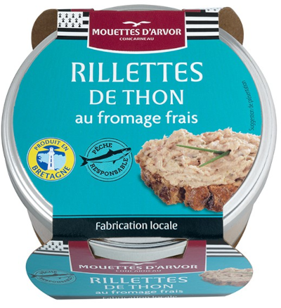 Ingredients: Salmon (58%, including smoked salmon 24%), water, sunflower oil, tuna, onions, potato starch, lemon juice (1.7%), spices, dill (0.2%),stabilizer: guar gum and carob seed flour. Mouettes d’Arvor produces an extensive line of tinned fish, including sardines, mackerel, anchovies, as well as a growing line of fish rillettes in glass jars. Mouettes d’Arvor is a brand of the Conserverie Jacques Gonidec, a family business founded in 1959. It is one of the very last artisanal fish canneries based at Concarneau, in Brittany. Using sustainable fishing practices, the fish are caught fresh, never frozen, and prepared by hand. The products are made with all-natural ingredients and no artificial flavoring.