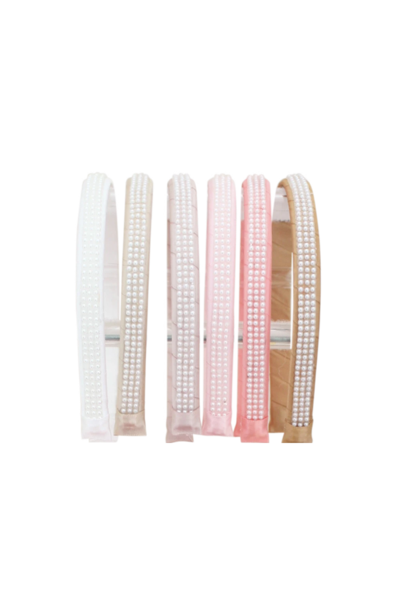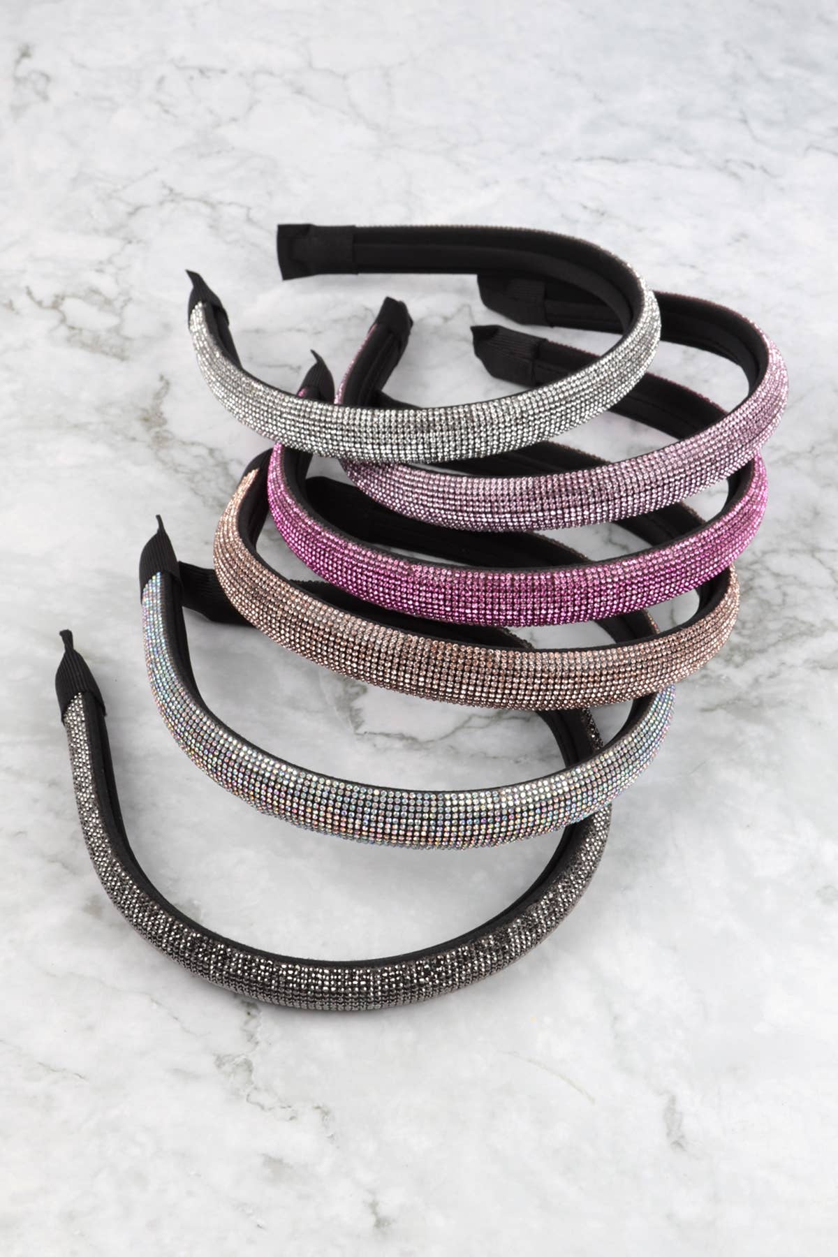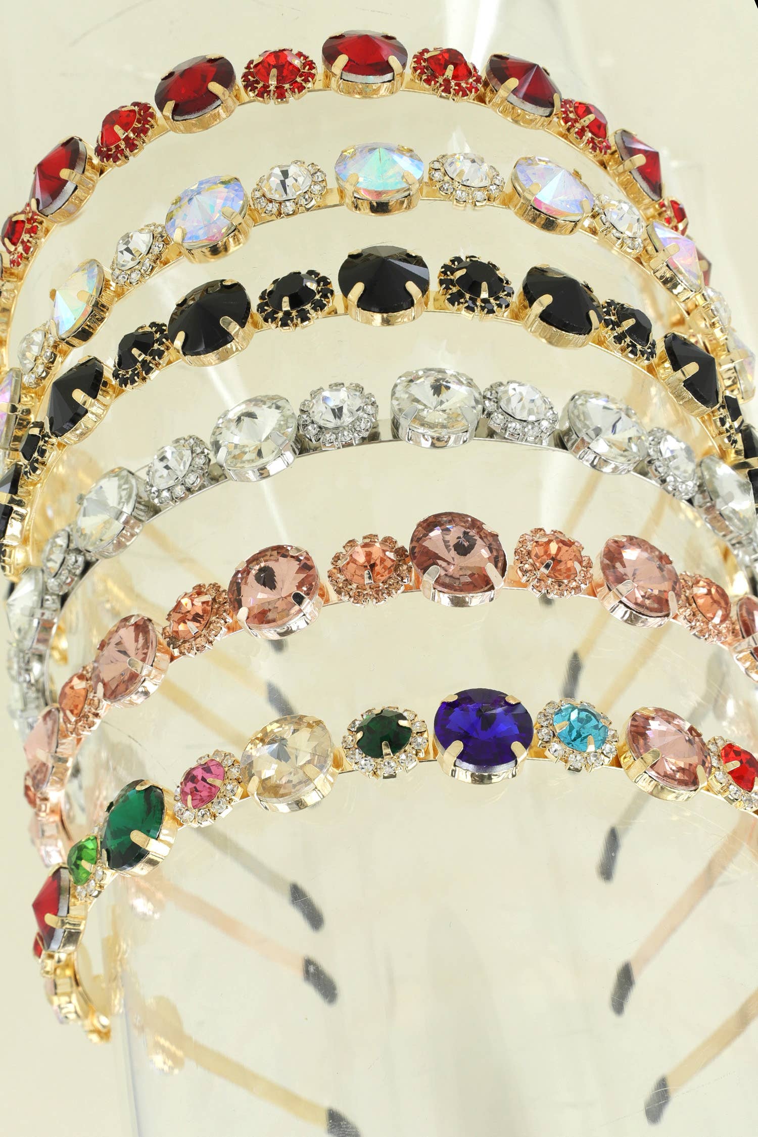Sparkling rhinestones on a hand-wrapped 1/2" satin headband.