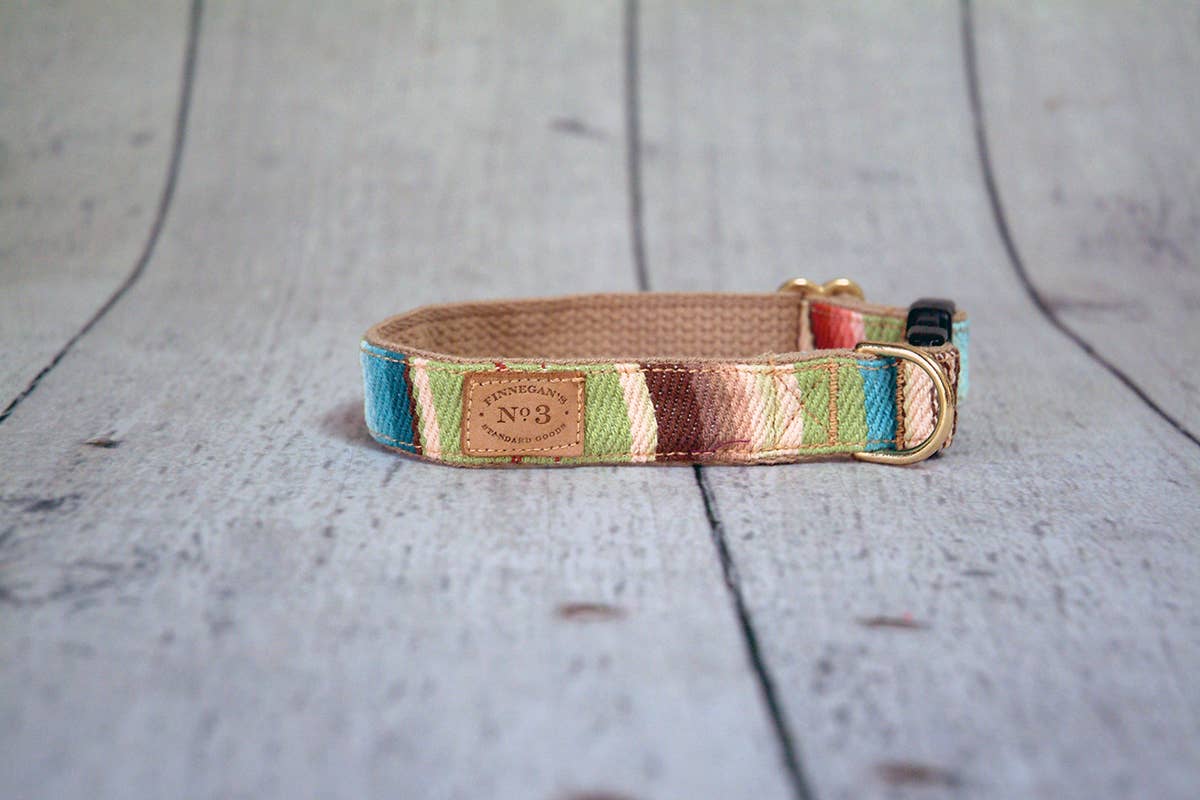 All of our accessories are made on lightweight soft cotton webbing. We use different fabrications, sourced from all over the world, accompanied by solid brass fittings and an adjustable collar. All of our products are handmade and assembled in San Francisco, California. Small fits up to a 13 inch neck. Medium its up to a 15 inch neck.
